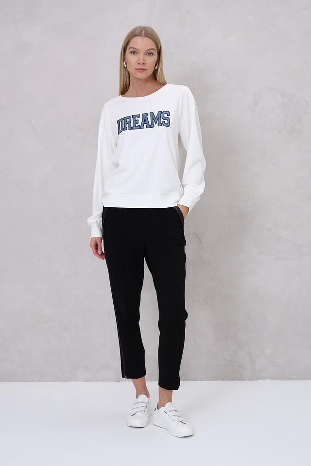 Белый пуловер Monari с яркой надписью "DREAMS" станет стильным дополнением к вашему гардеробу. Модель выполнена из мягкого и приятного к телу трикотажа, обеспечивающего комфорт в течение дня. Состав: вискоза 69%, полиэстер 27%, эластан 4%