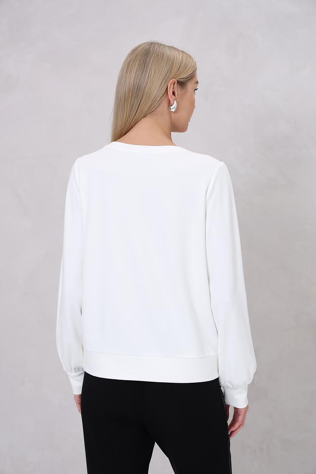 Пуловер изготовлен из высококачественного трикотажа, в составе которого вискоза, полиэстер и эластан. Благодаря этому сочетанию материалов, изделие обладает мягкостью, эластичностью и приятными тактильными ощущениями.
