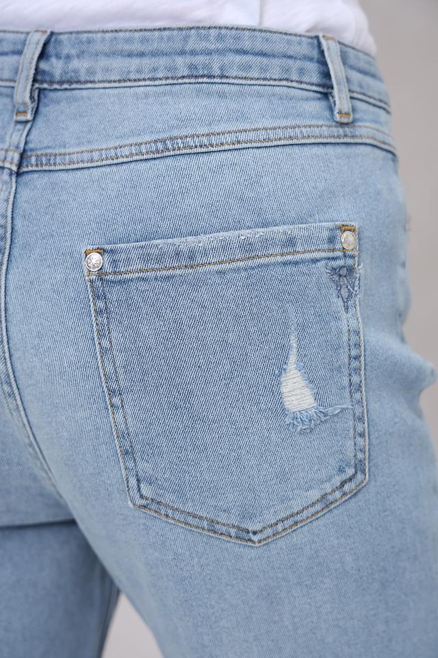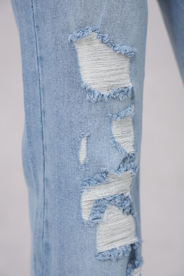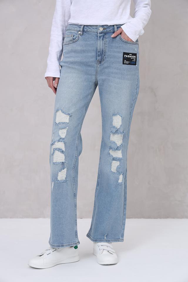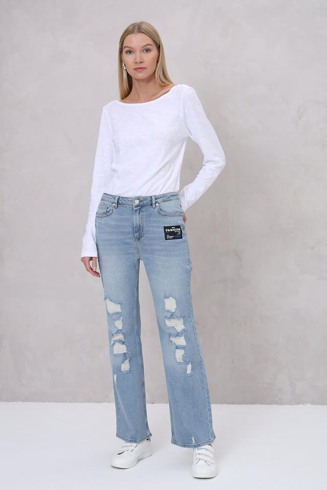 Джинсы имеют высокую посадку, которая подчеркивает талию и визуально удлиняет ноги. Декоративные рваности добавляют образу дерзости и актуальности. На заднем кармане расположена стильная нашивка с логотипом бренда.