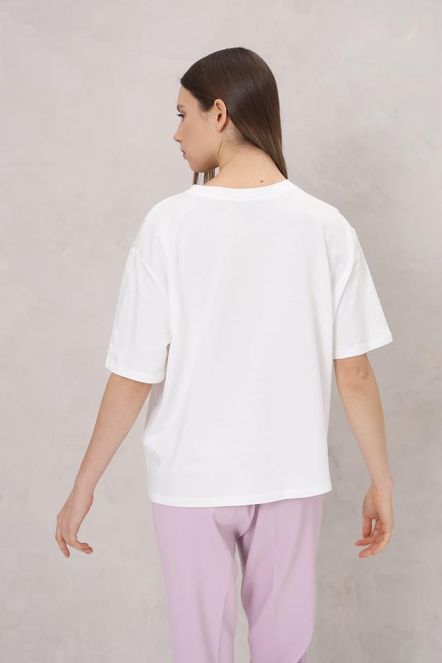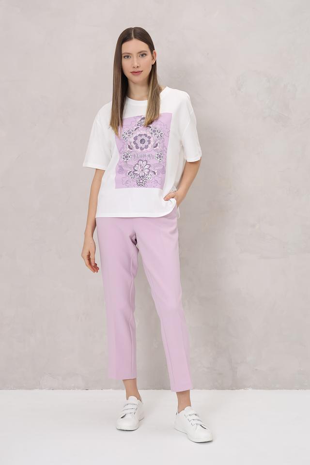 Особенностью данной футболки является крупный цветочный принт в нежных лиловых оттенках, расположенный на передней части изделия. Принт выполнен в графичном стиле, добавляя современности образу. Футболка имеет свободный крой, который не сковывает движений и позволяет создать расслабленный силуэт.