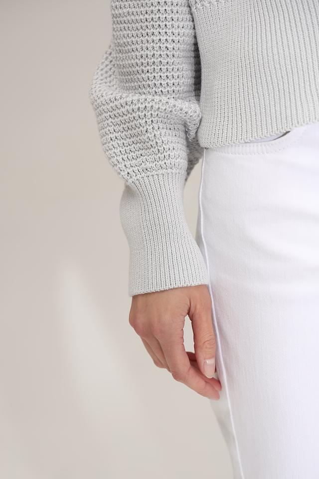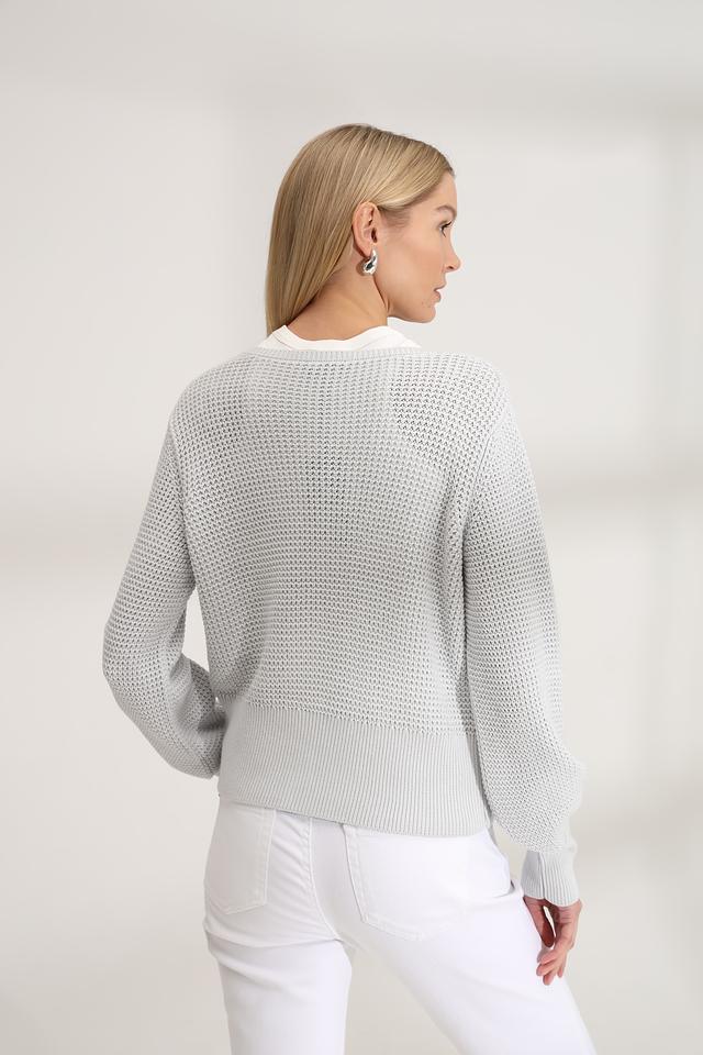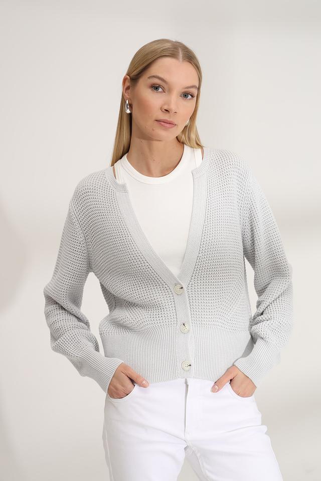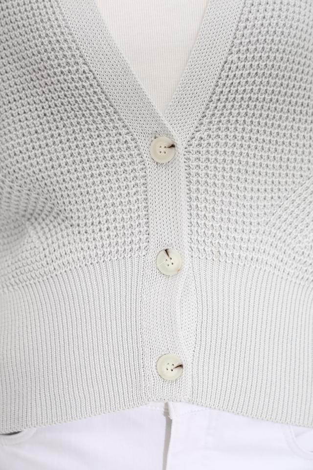 Светло-серый кардиган Monari из фактурного трикотажа с V-образным вырезом и рукавами-фонариками. Модель застегивается на пуговицы и идеально дополнит повседневный образ. Состав: хлопок 50%, полиакрил 50%