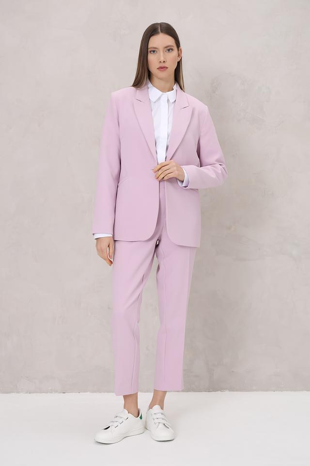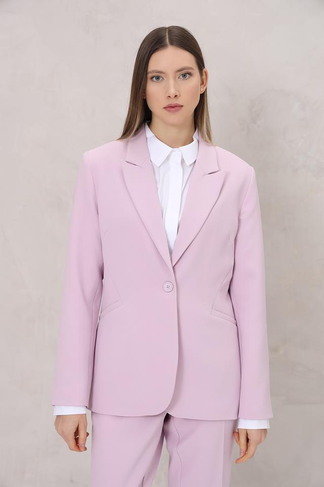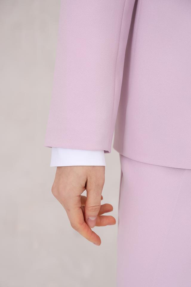 Жакет имеет классический прямой крой, который подходит практически любой фигуре. Лацканы добавляют строгости и деловитости, а застежка на одну пуговицу подчеркивает талию. Длинные рукава с аккуратными манжетами завершают образ.