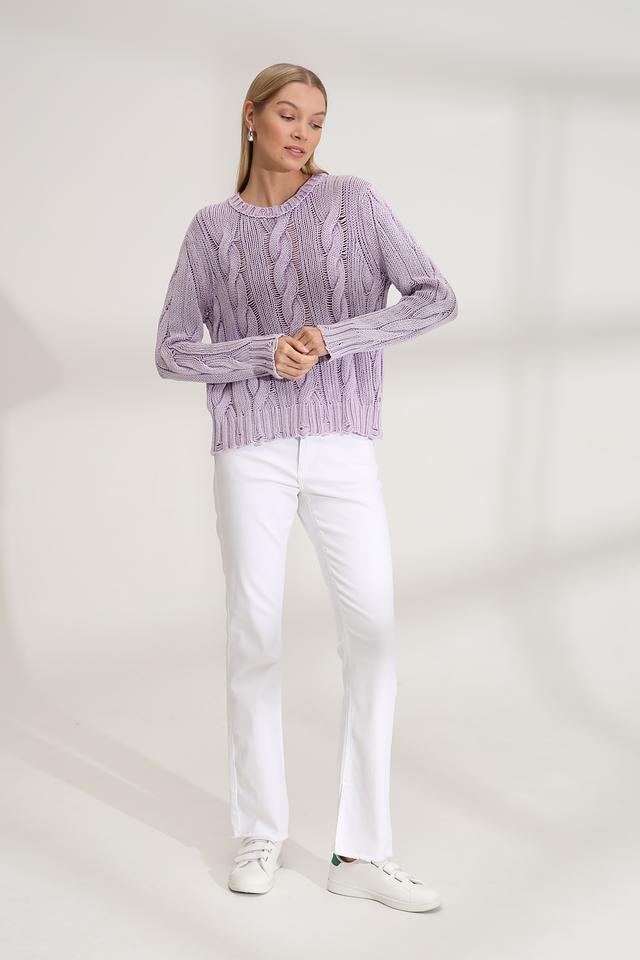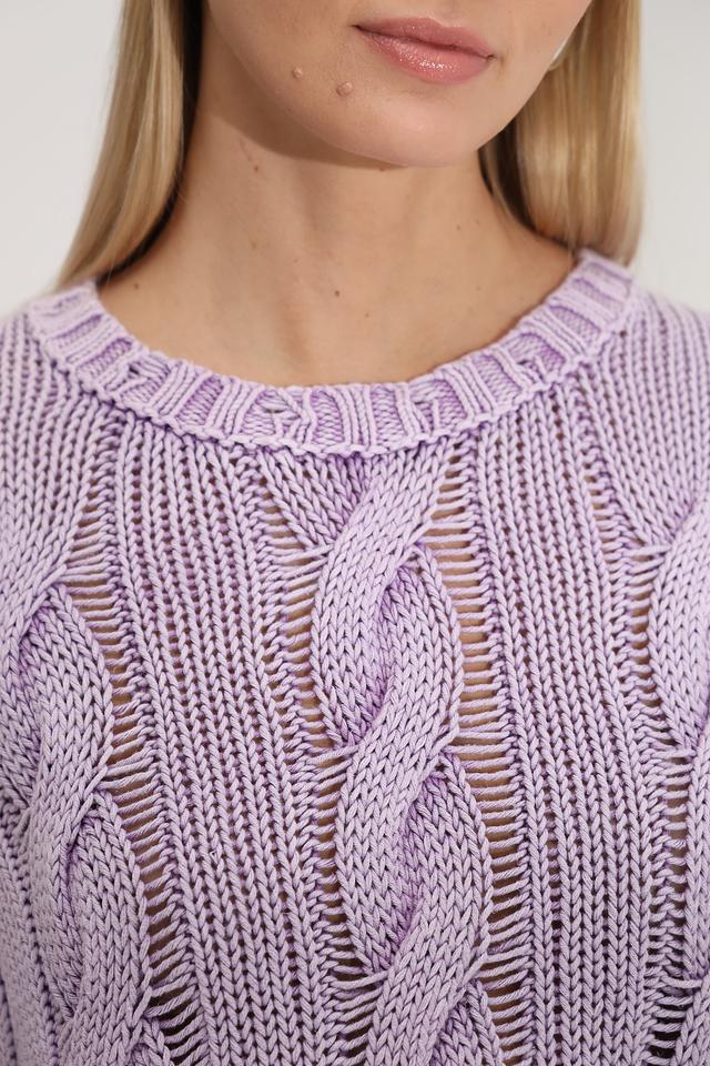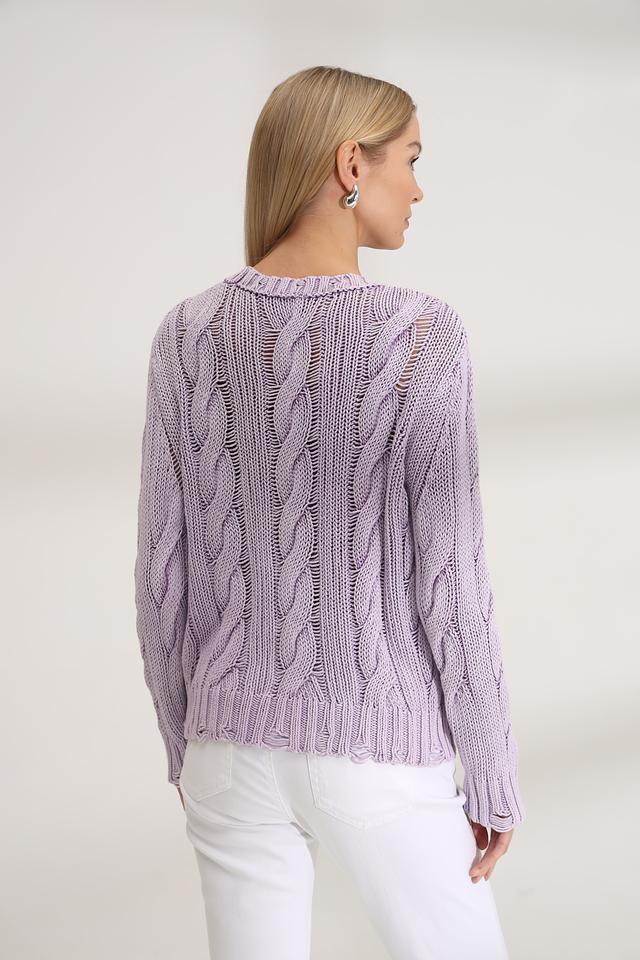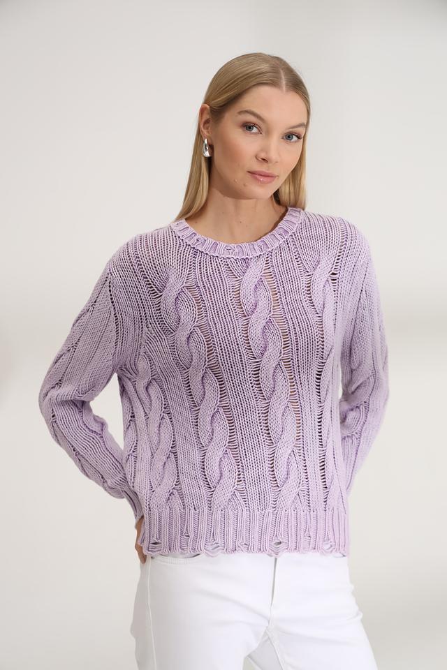 Пуловер имеет лавандовый оттенок и украшен выразительным узором из кос, придающим ему оригинальность и текстуру. Круглый вырез горловины и длинные рукава делают его универсальным для различных стилей.