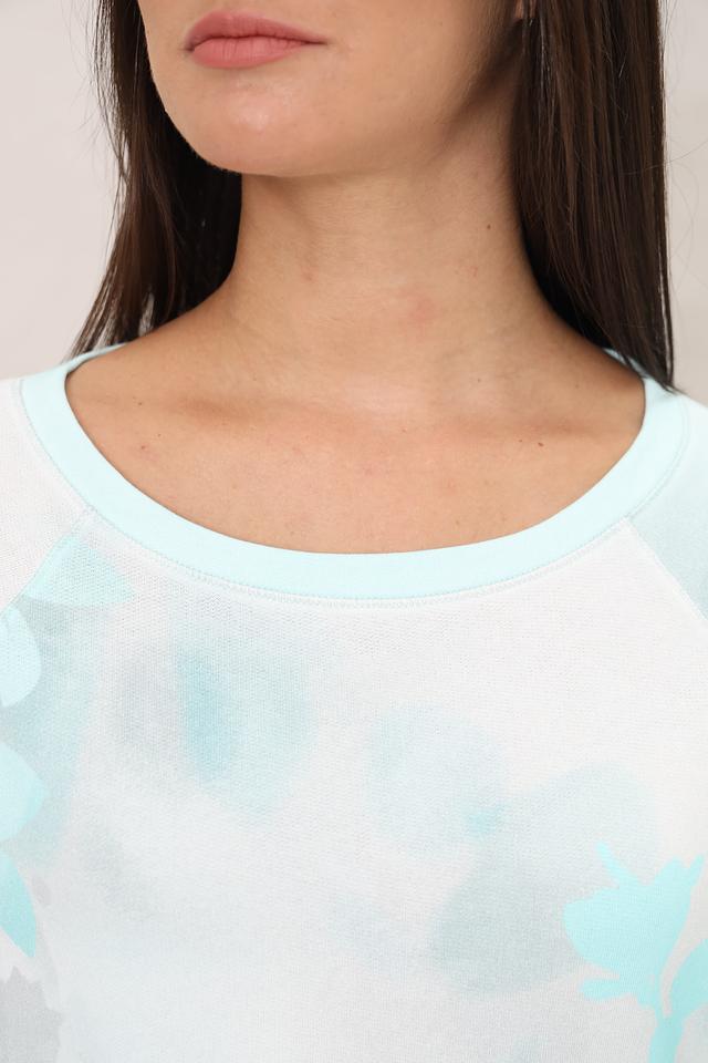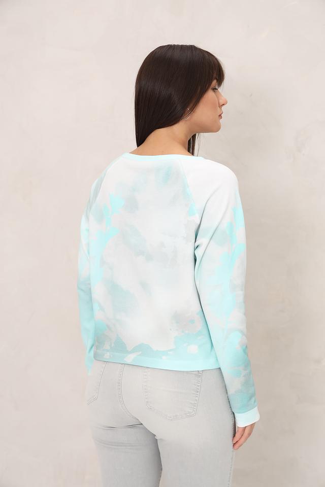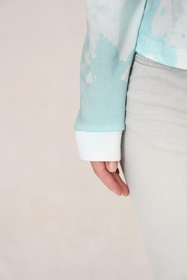 Особенностью модели является эффект tie-dye – уникальный рисунок, созданный путем окрашивания ткани в различных оттенках голубого и белого. Этот принт придает пуловеру неповторимый и стильный вид.
