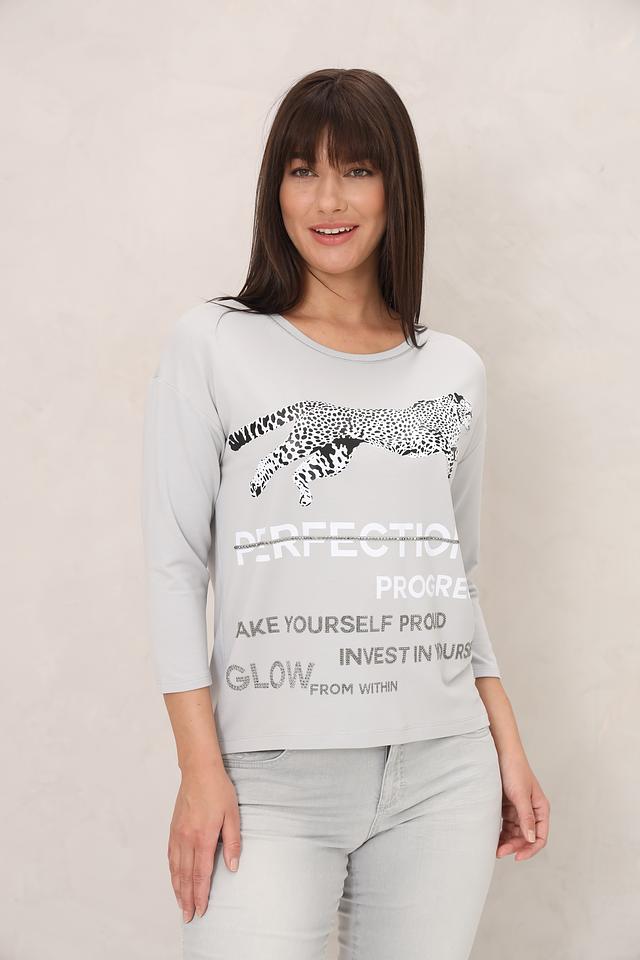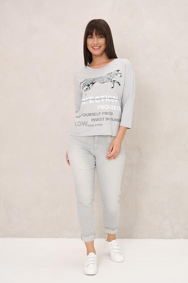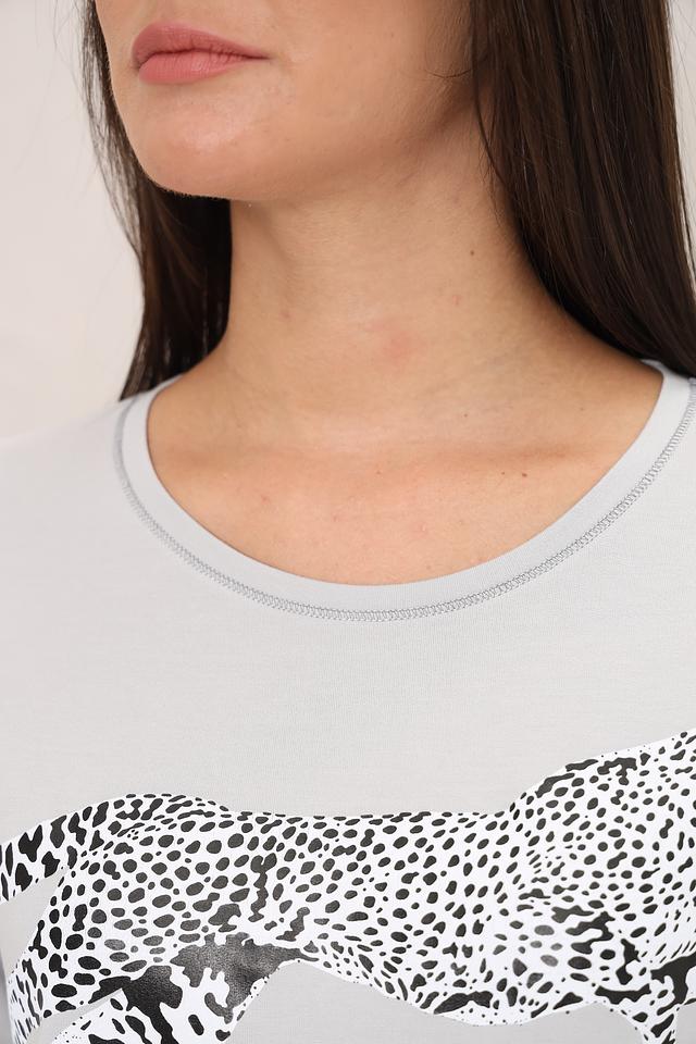 Стильный лонгслив Monari светло-серого цвета с ярким леопардовым принтом и мотивирующей надписью. Изготовлен из мягкой и приятной к телу ткани с добавлением вискозы, модала и эластана, обеспечивающей комфорт при носке. Состав: вискоза 45%, модал 45%, эластан 10%