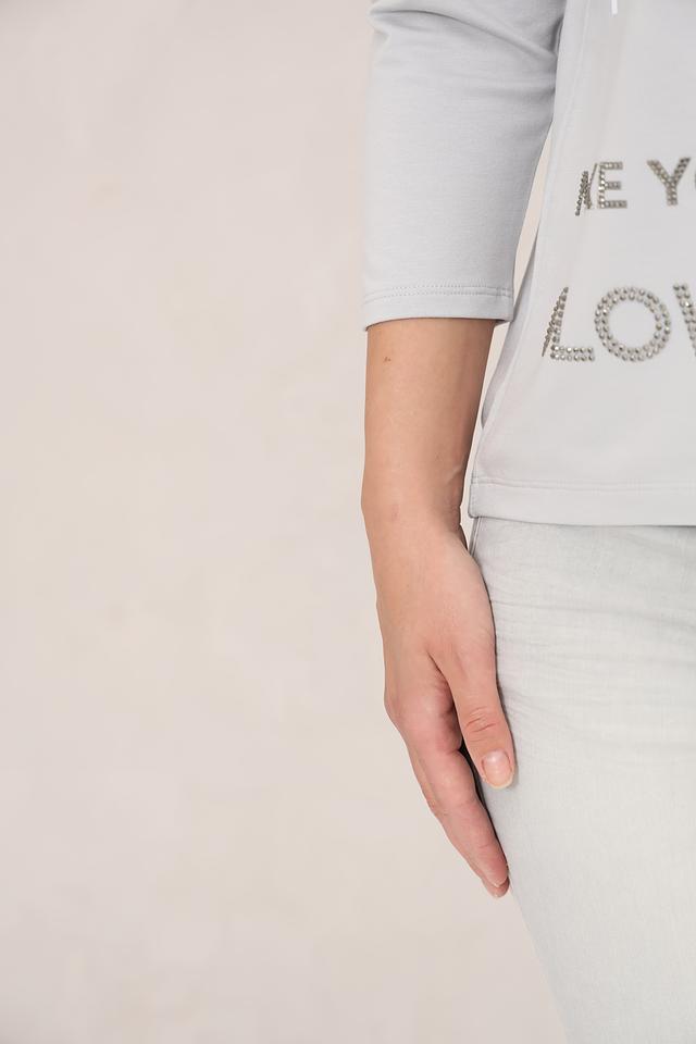 Этот лонгслив от Monari станет отличным дополнением к вашему гардеробу. Выполненный в светло-сером цвете, он украшен эффектным принтом леопарда и вдохновляющей надписью, что делает его уникальным и привлекательным.