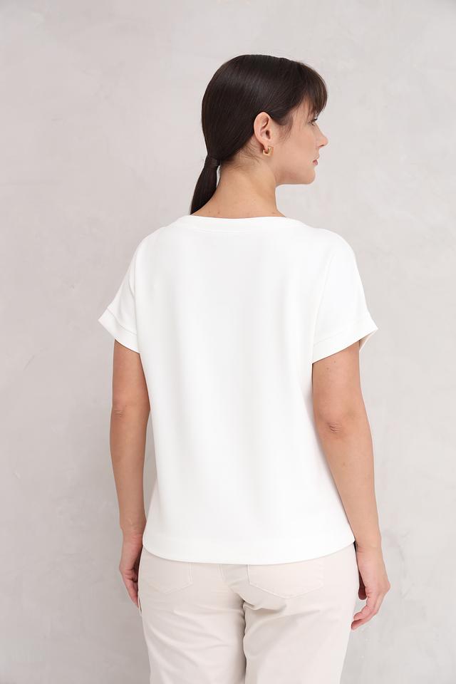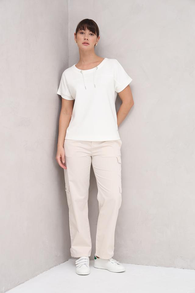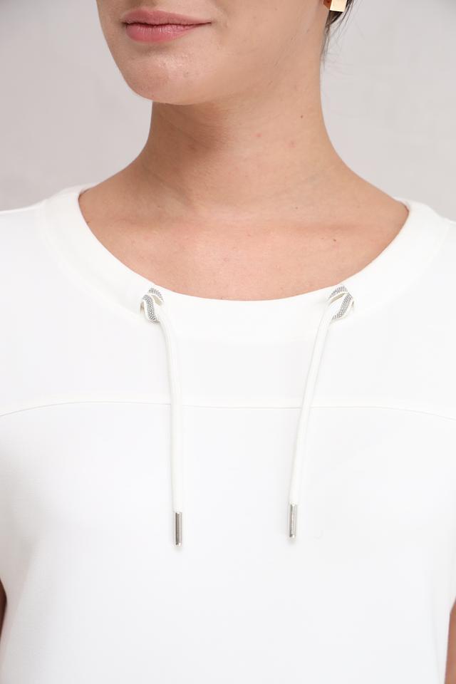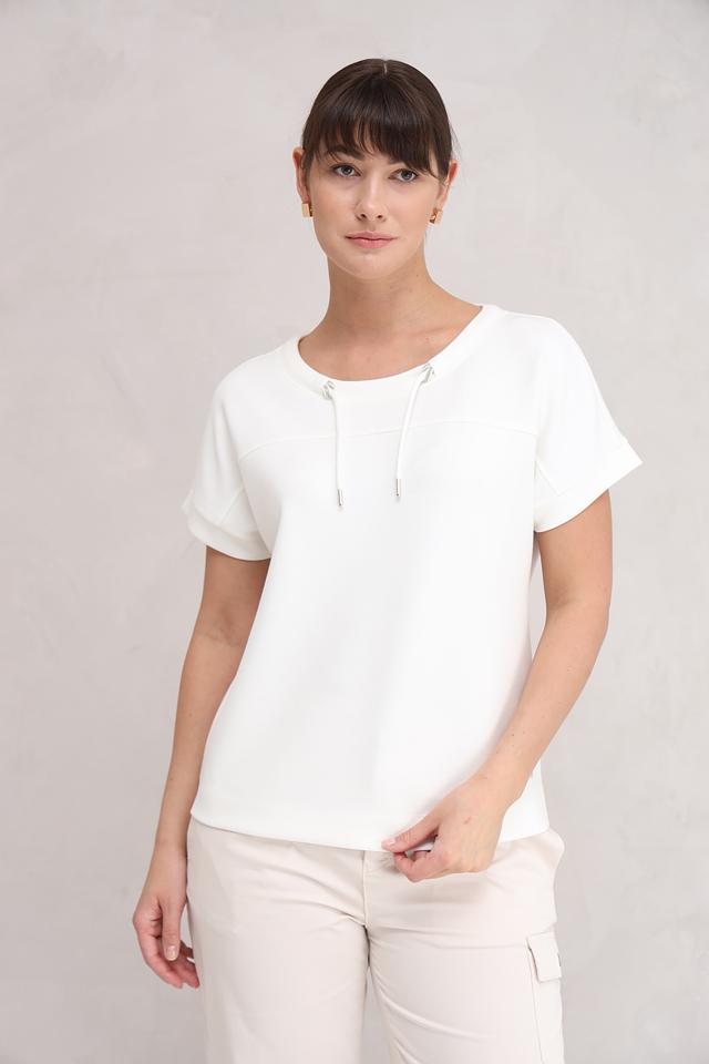 Белая футболка Monari с короткими рукавами и завязками на горловине. Изготовлена из мягкого и приятного к телу модала с добавлением полиэстера и эластана, обеспечивающих комфорт и хорошую посадку. Состав: модал 52%, полиэстер 42%, эластан 6%