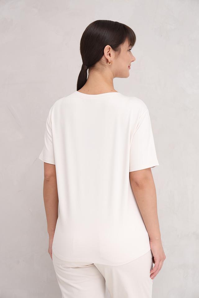 Модель имеет прямой крой и короткие рукава, что обеспечивает свободу движений и комфорт в жаркую погоду. Футболка изготовлена из высококачественного трикотажа, в составе которого 45% вискоза, 45% модал и 10% эластан. Благодаря этому сочетанию материалов, футболка приятна к телу, хорошо держит форму и не мнется.