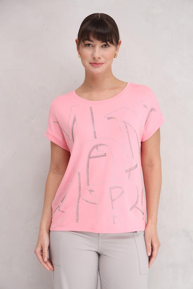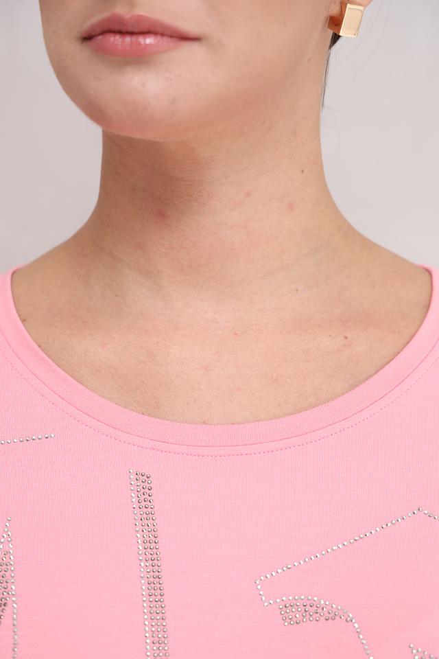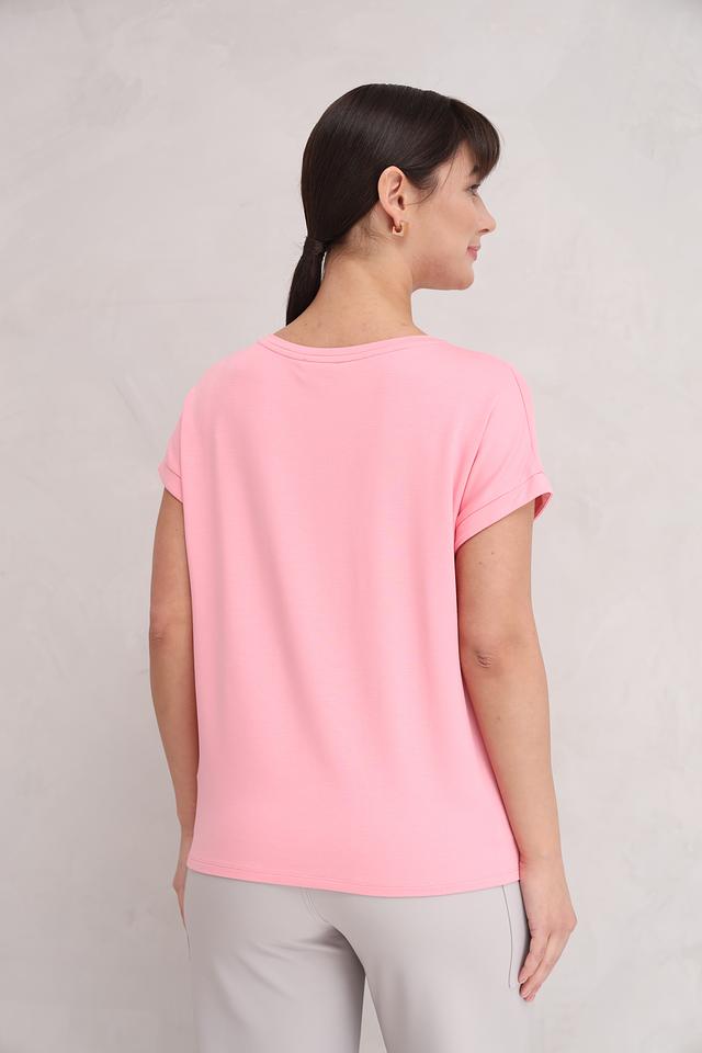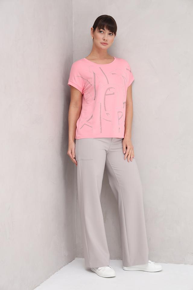 Розовая футболка Monari с оригинальным декором в виде абстрактного рисунка. Изготовлена из мягкой и приятной к телу ткани с добавлением вискозы и модала, обеспечивающей комфорт в носке. Состав: вискоза 45%, модал 45%, эластан 10%