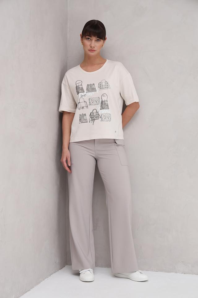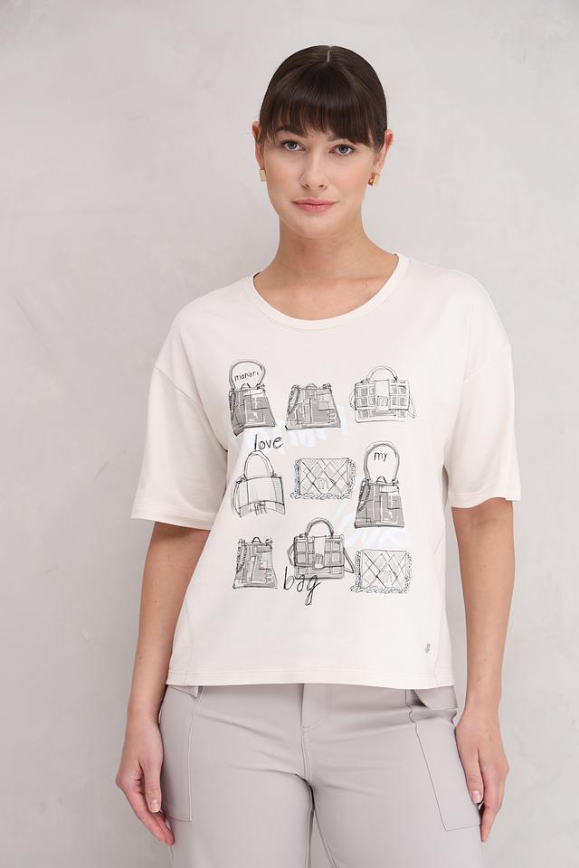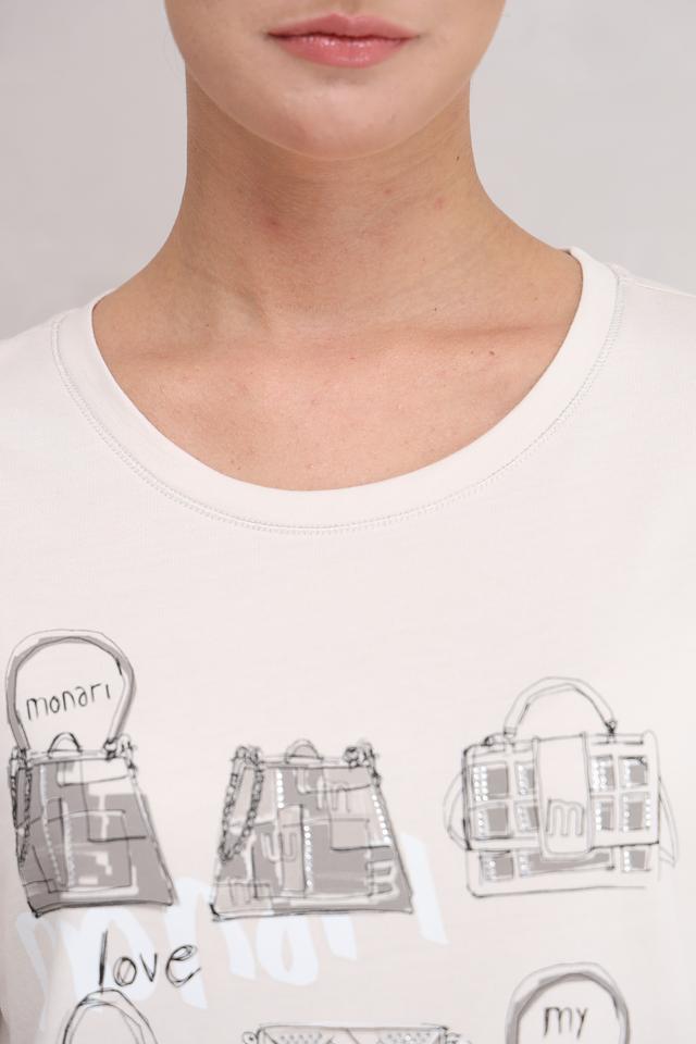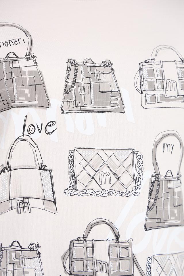 Эта футболка от Monari станет отличным дополнением к вашему гардеробу. Она выполнена в белом цвете и украшена графичным принтом, изображающим различные сумки.