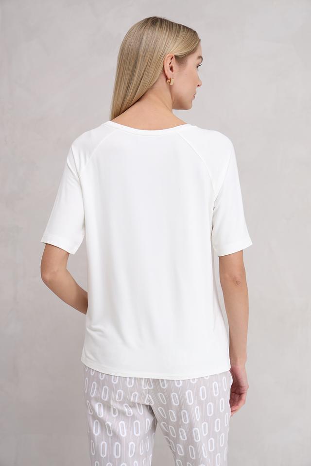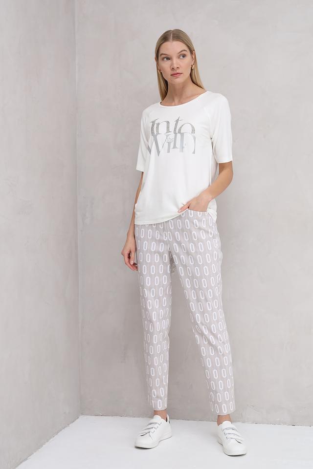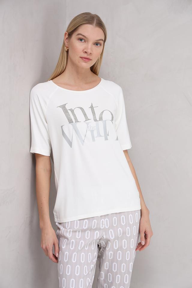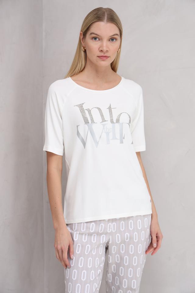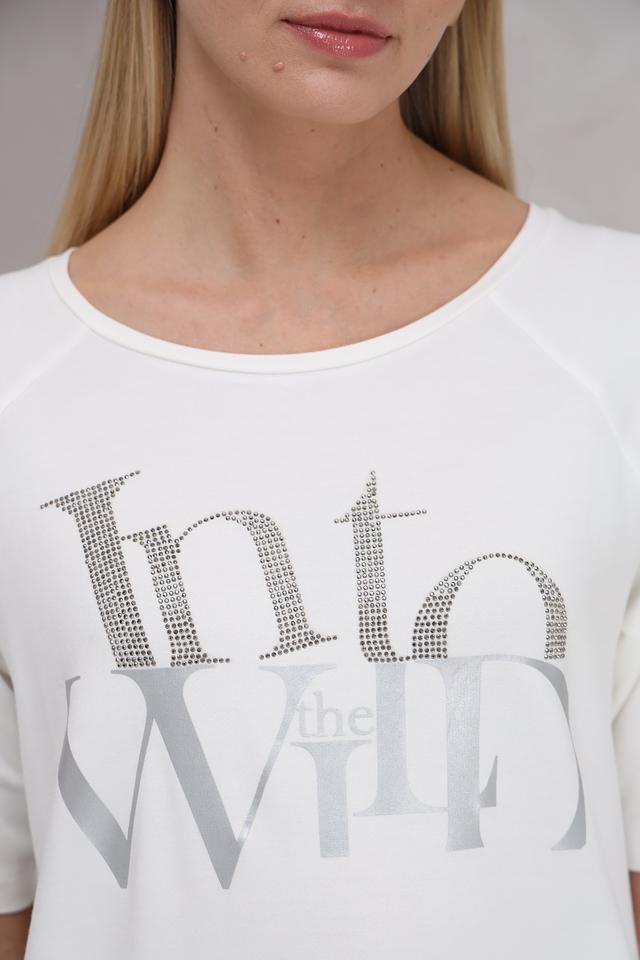 Белая футболка Monari с оригинальным декором из страз и серебристой надписью "Into the Wild". Изготовлена из мягкой и приятной к телу ткани на основе вискозы, модала и эластана. Состав: вискоза 45%, модал 45%, эластан 10%