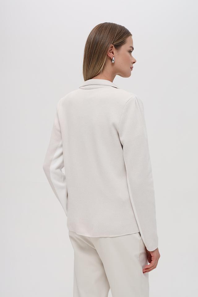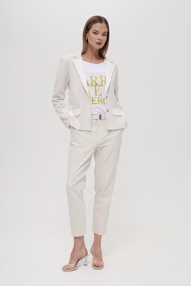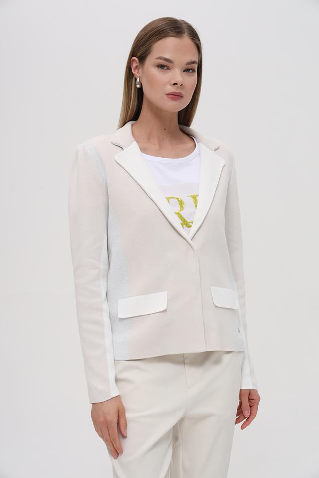 Жакет имеет классический отложной воротник и застегивается на одну пуговицу. Отличительной особенностью модели является контрастная отделка лацканов и карманов, выполненная в белом цвете с добавлением металлизированной нити.