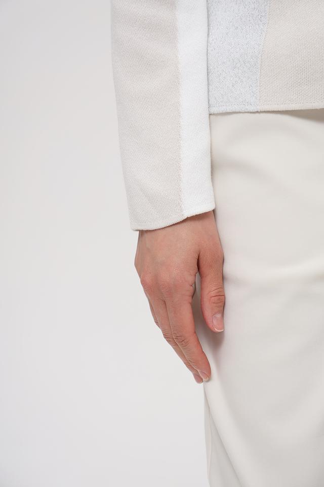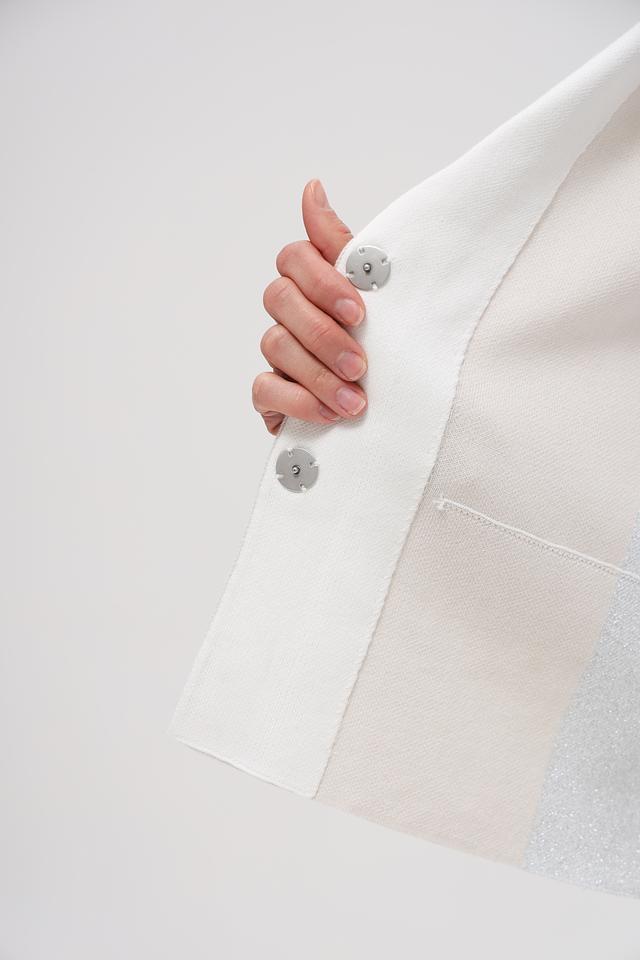 Состав ткани: 97% хлопок, 3% металлизированная нить. Хлопок обеспечивает комфорт и воздухопроницаемость, а добавление металлизированной нити придает жакету блеск и роскошь. Жакет идеально подойдет для создания как деловых, так и повседневных образов.