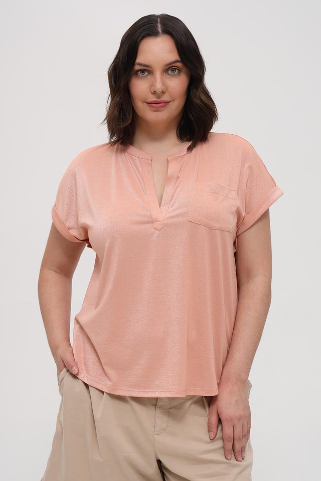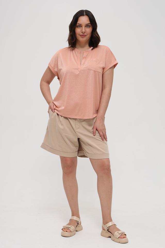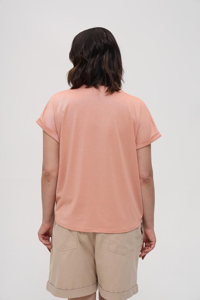 Персиковая футболка Monari с V-образным вырезом и короткими рукавами – стильное и комфортное решение для повседневного образа. Изготовлена из приятной на ощупь ткани с добавлением металлизированной нити, что придает ей легкий блеск. Состав: полиэстер 49%, вискоза 26%, метализ.полиэстер 22%, эластан 3%
