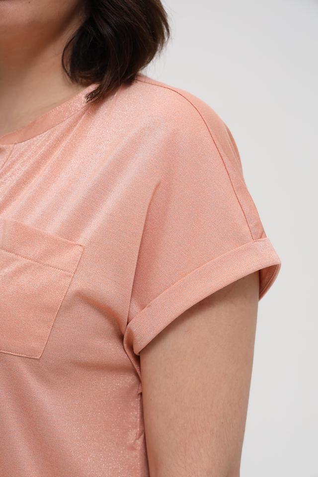 Короткие рукава и свободный крой обеспечивают комфорт в жаркую погоду. На груди расположена небольшая накладная деталь с карманом, которая добавляет оригинальности. Ткань футболки содержит полиэстер, вискозу, металлизированное волокно и эластан, благодаря чему она приятна к телу, хорошо держит форму и слегка мерцает на свету.