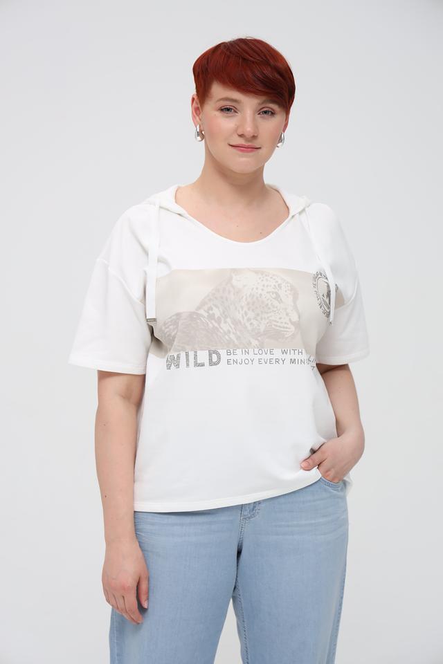 Белая блуза Monari с оригинальным принтом "Wild" и короткими рукавами станет стильным дополнением к вашему гардеробу. Модель с капюшоном и свободным кроем обеспечивает комфорт и свободу движений. Состав: хлопок 70%, полиэстер 30%