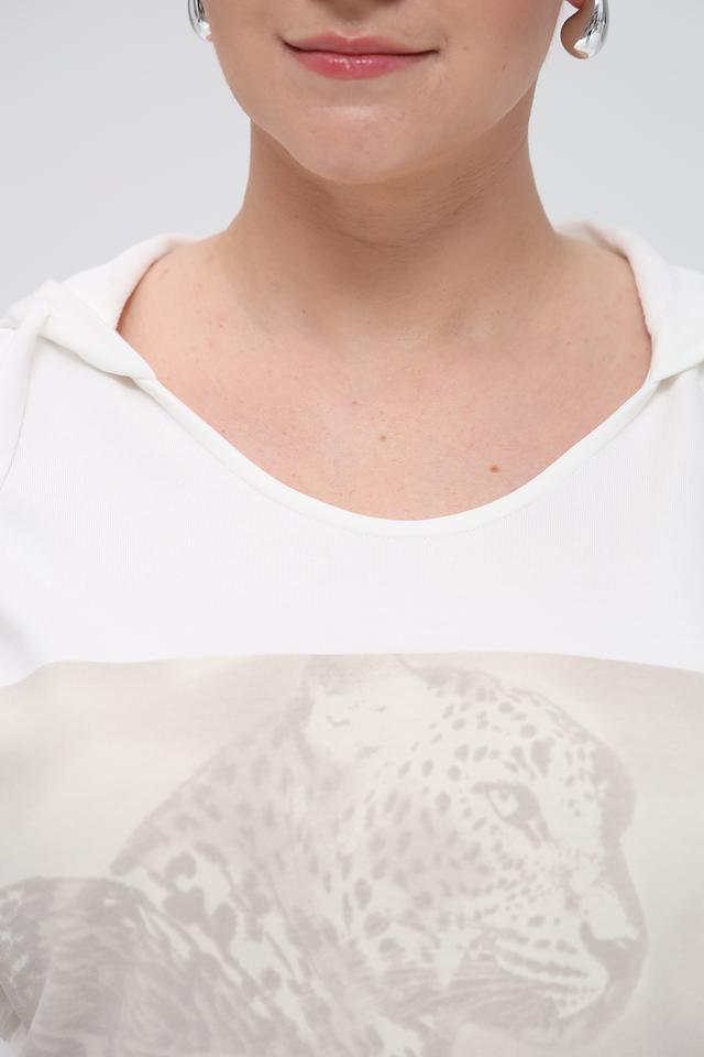 Эта блуза от Monari выполнена в белом цвете и украшена эффектным принтом с изображением дикой кошки. Модель имеет свободный крой, короткие рукава и удобный капюшон, что делает ее идеальным выбором для повседневной носки.