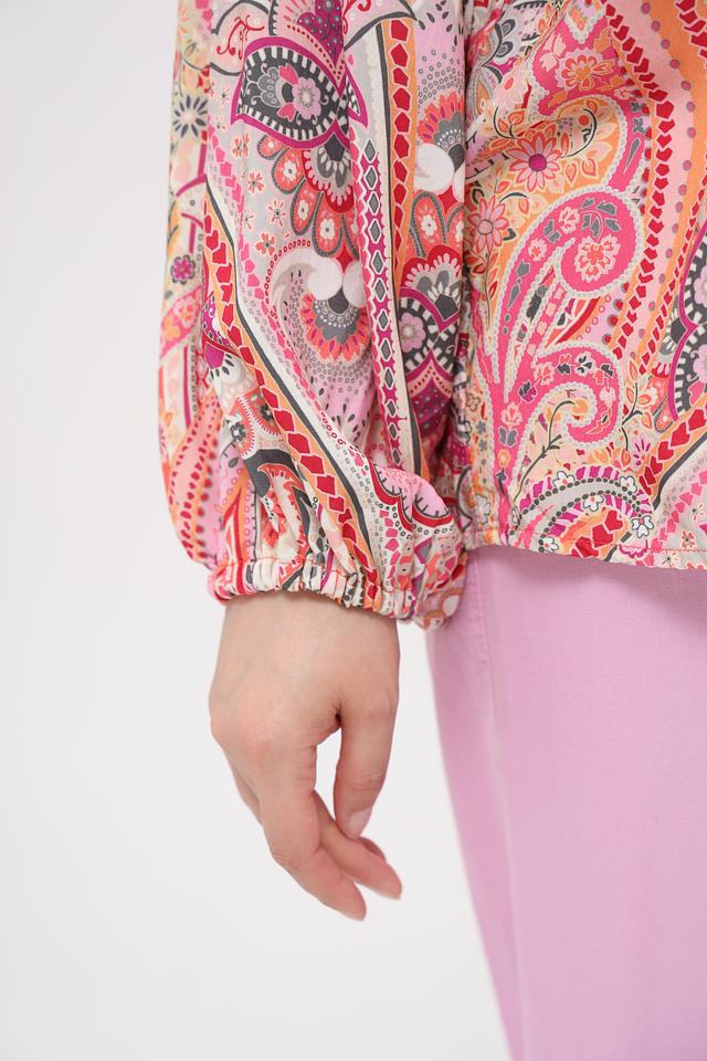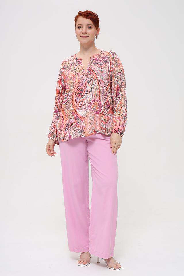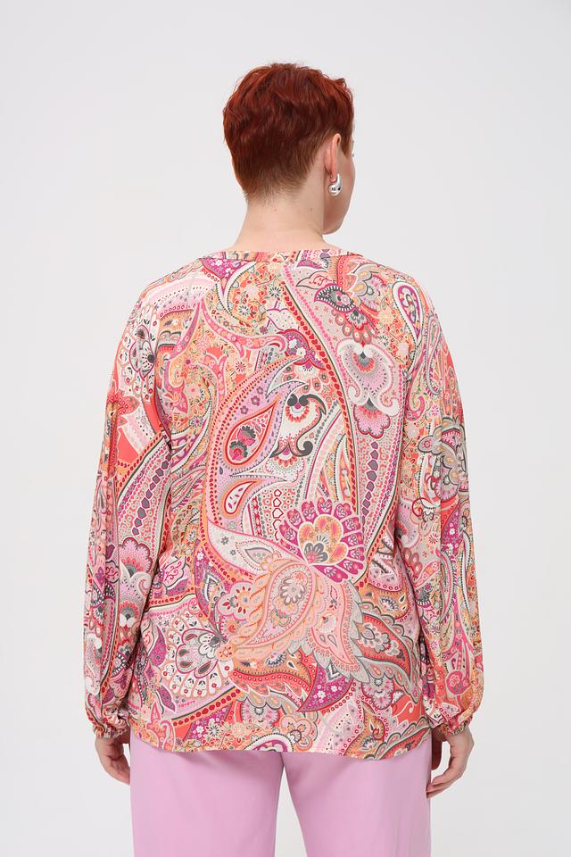 Особенностью данной модели является ее оригинальный принт пейсли, выполненный в оранжево-розовой гамме. V-образный вырез горловины и рукава с манжетами добавляют блузе изысканности и женственности.