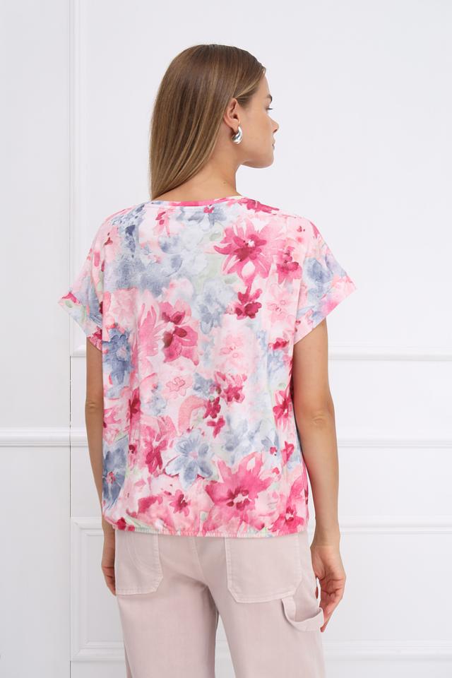 Эта стильная футболка от Monari станет незаменимой вещью в вашем повседневном гардеробе. Футболка выполнена в нежно-розовой цветовой гамме и украшена ярким, красочным цветочным принтом, который придает ей женственности и легкости.