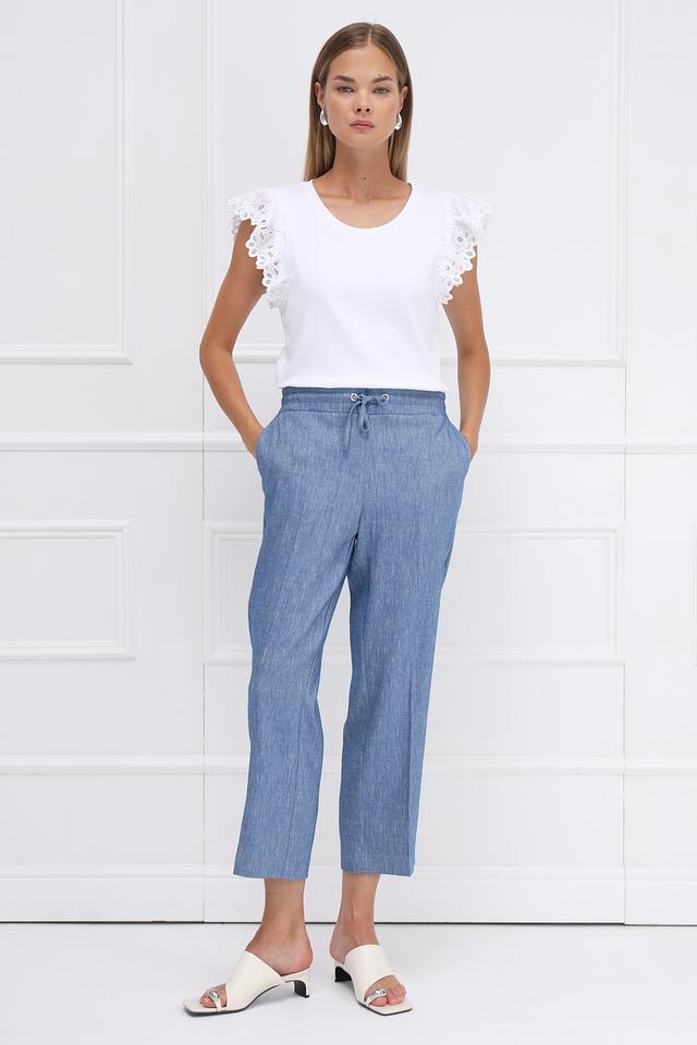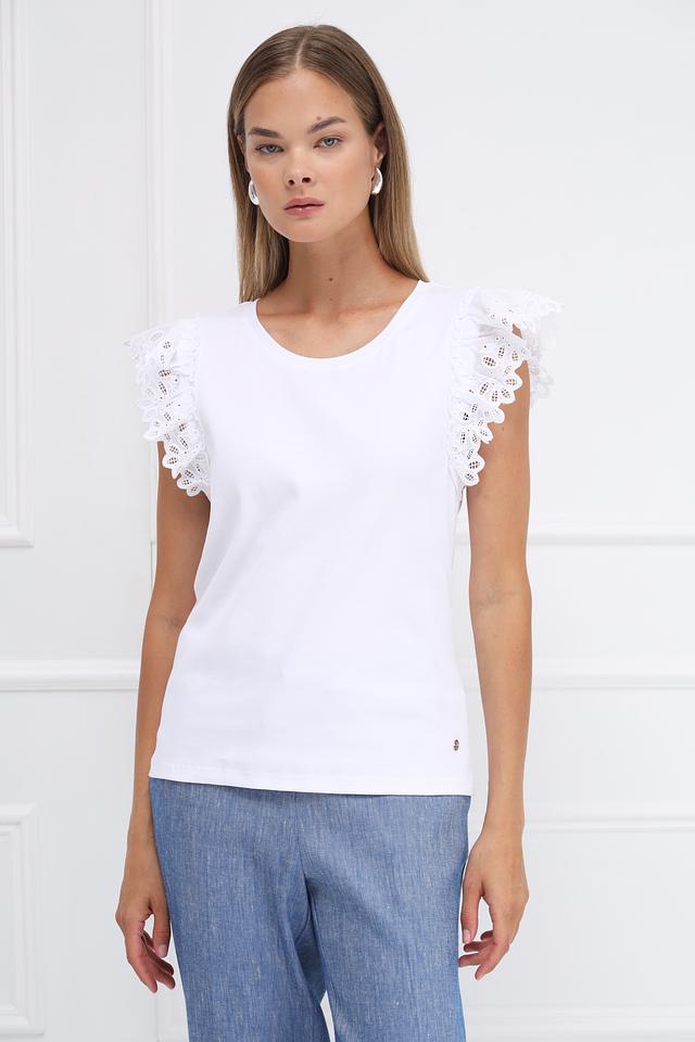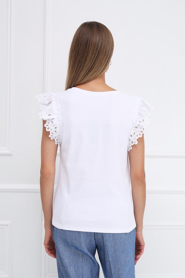 Особенностью модели является деликатный кружевной декор на рукавах, который придает ей романтичный и женственный вид. Футболка имеет классический круглый вырез горловины и короткие рукава.