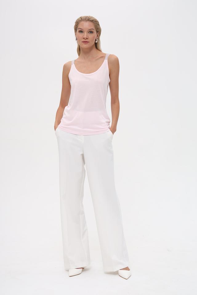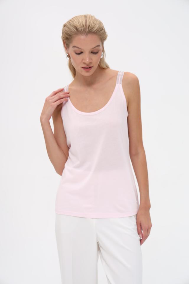 Модель имеет классический крой с тонкими бретелями и округлым вырезом. Бретели декорированы небольшими стразами, которые придают топу изысканность и блеск.
