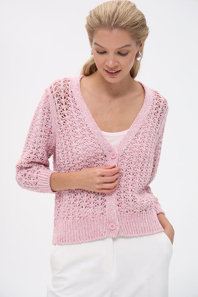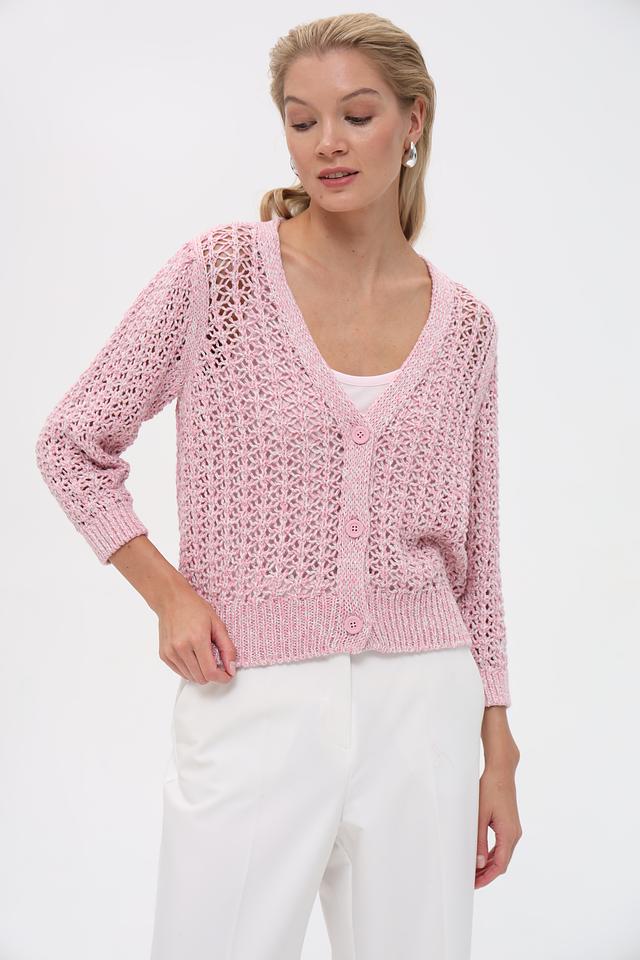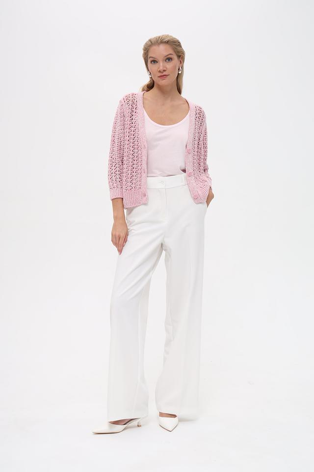 Этот жакет от Monari выполнен в нежном розовом цвете и отличается ажурным дизайном. Модель имеет V-образный вырез и застёжку на пуговицы, что позволяет создавать различные варианты стилизации.