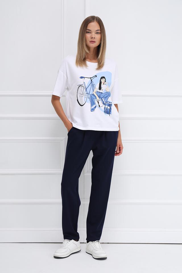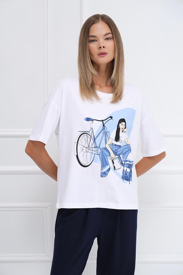 Особенностью данной футболки является оригинальный принт на лицевой стороне, изображающий девушку на велосипеде в голубых тонах. Принт выполнен в графичном стиле, добавляя образу современности и динамики.