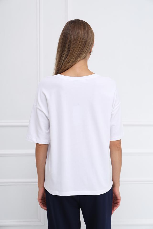 Футболка имеет свободный крой, который не сковывает движений и позволяет создать расслабленный силуэт. Короткие рукава и круглый вырез горловины делают ее универсальной и подходящей для различных типов фигуры. Эта футболка станет прекрасной базой для создания множества интересных образов.