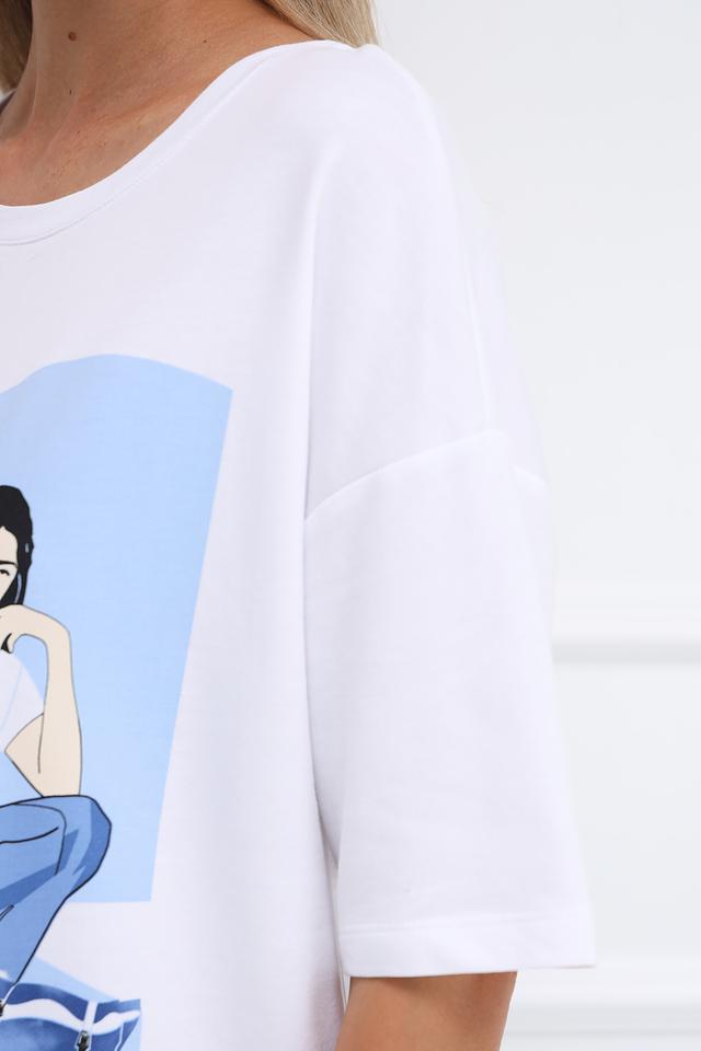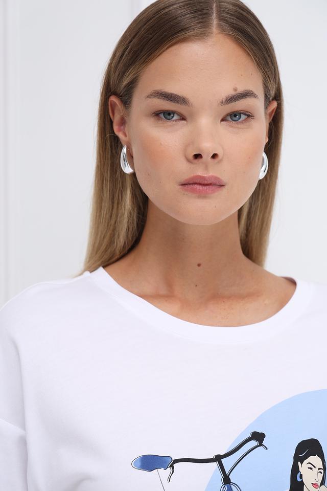 Белая футболка Monari с ярким принтом в виде девушки на велосипеде станет стильным дополнением к вашему гардеробу. Модель свободного кроя выполнена из мягкого хлопка с модалом, обеспечивающего комфорт в носке. Состав: хлопок 50%, модал 50%