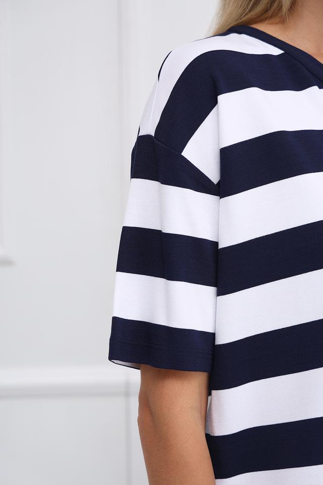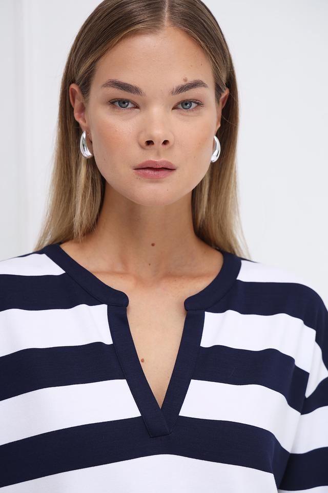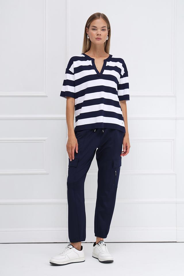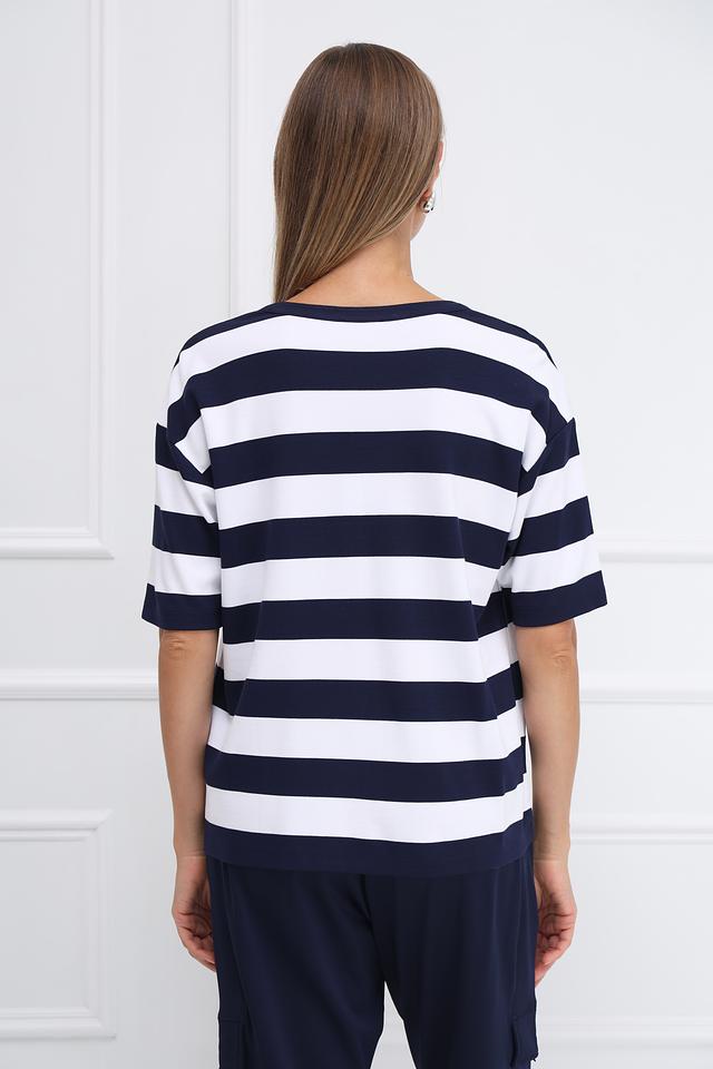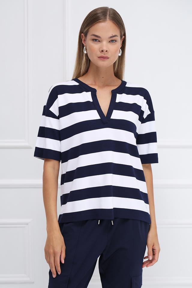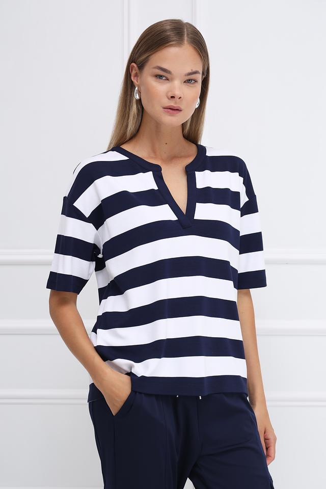 Женская футболка Monari синего и белого цвета с полоской и V-образным вырезом. Изготовлена из мягкой вискозы с добавлением полиэстера и эластана для комфорта и хорошей посадки. Состав: вискоза 80%, полиэстер 15%, эластан 5%