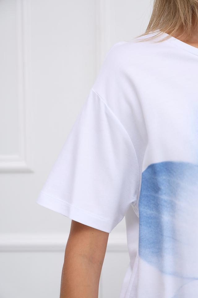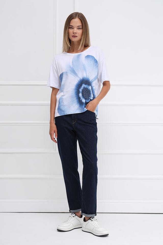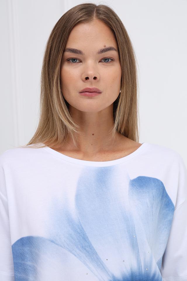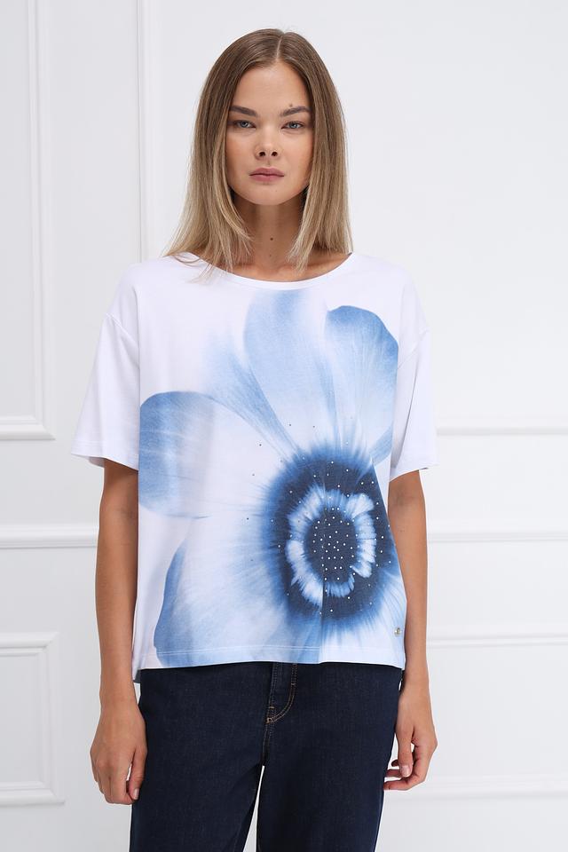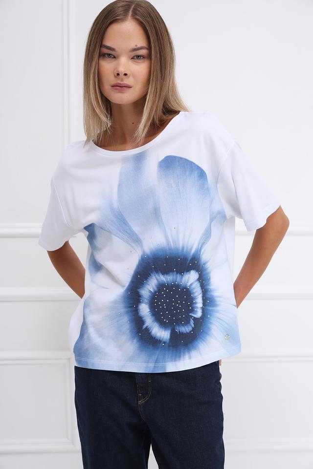 Эта блуза от Monari станет ярким акцентом в вашем гардеробе. Выполнена в белом цвете с эффектным принтом в виде крупного голубого цветка.