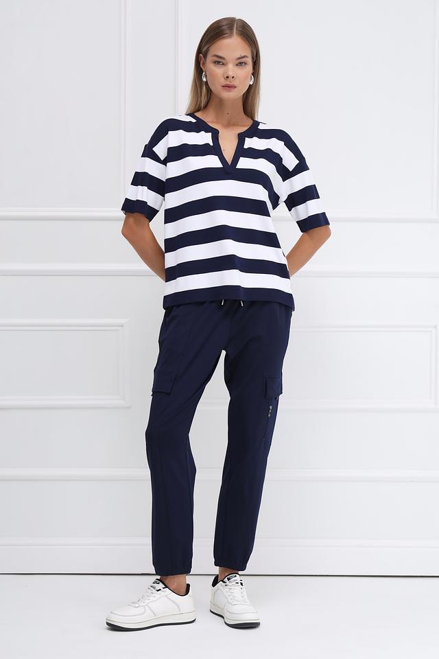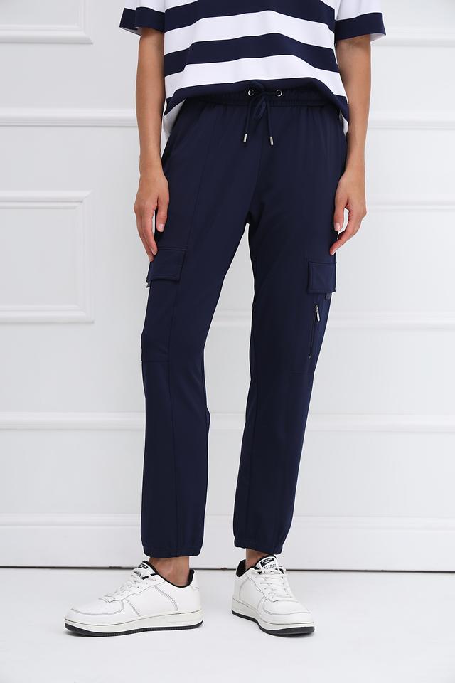 Представляем стильные брюки карго от бренда Monari. Эта модель выполнена в насыщенном темно-синем цвете, который легко сочетается с различными элементами гардероба.