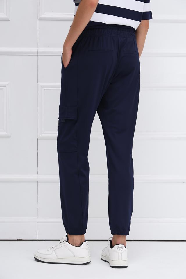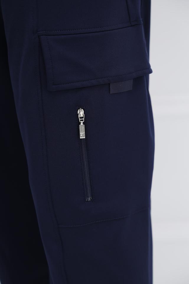 Брюки имеют удобный крой с эластичным поясом и манжетами на щиколотках, обеспечивающими комфортную посадку. Функциональные накладные карманы добавляют практичности и подчеркивают современный дизайн.