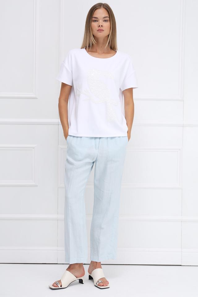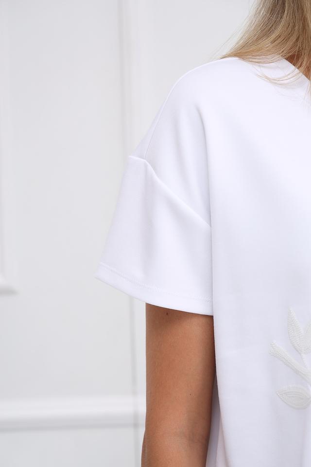 Особенностью данной модели является оригинальный принт в виде птицы, выполненный в белых и светло-серых тонах. Футболка имеет прямой крой, короткие рукава с небольшим подворотом и круглый вырез горловины.