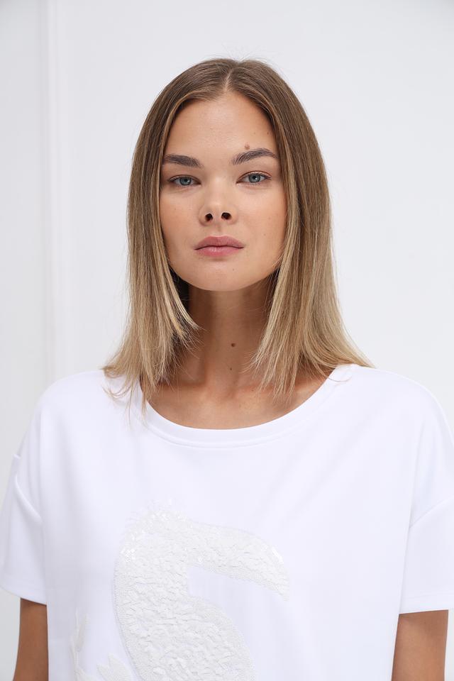 Белая футболка Monari с оригинальным принтом — стильное и комфортное решение для повседневного образа. Изготовлена из мягкого сочетания полиэстера, вискозы и эластана, обеспечивающего удобную посадку и приятные ощущения на коже. Состав: полиэстер 55%, вискоза 38%, эластан 7%