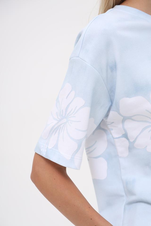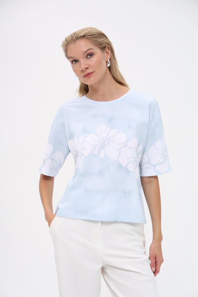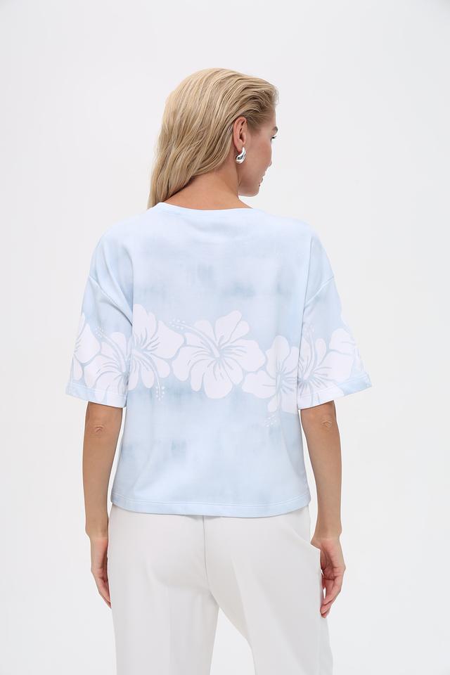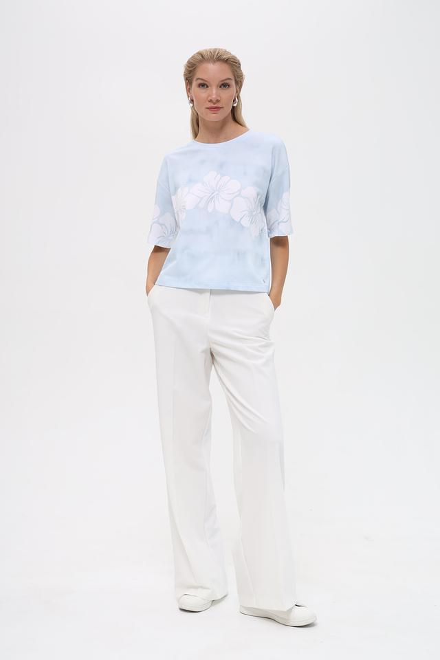 Женский пуловер Monari нежно-голубого цвета с цветочным принтом в технике тай-дай. Модель свободного кроя с короткими рукавами станет отличным дополнением к вашему образу. Состав: хлопок 70%, полиэстер 30%