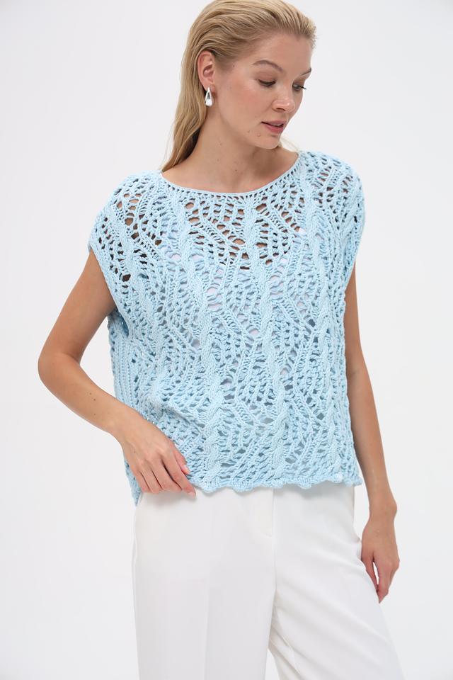 Ажурный узор придает изделию изысканность и женственность. Короткие рукава и округлый вырез горловины делают этот пуловер универсальным и подходящим для различных случаев. Текстура изделия выполнена в виде сложного плетения, создающего эффект воздушности.