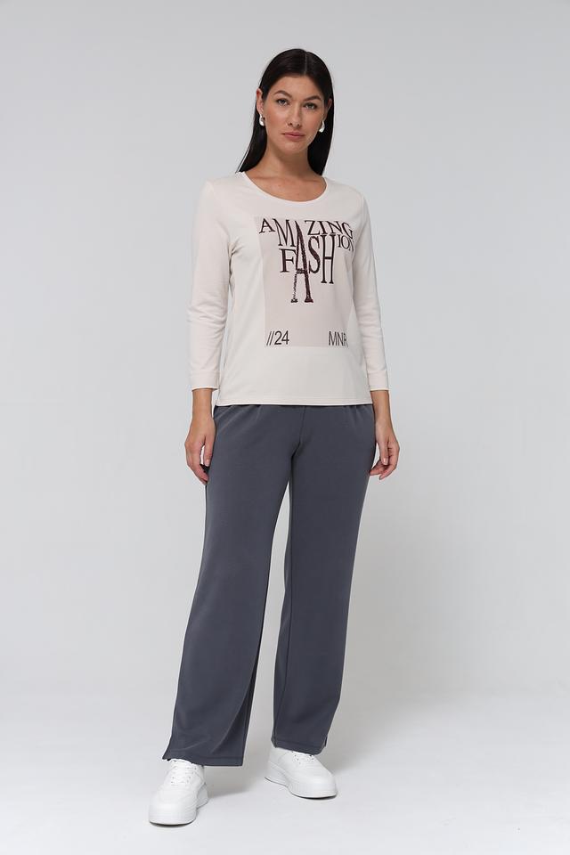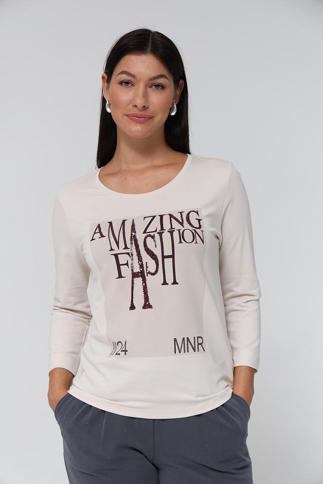 Бежевая футболка Monari с оригинальным принтом "Amazing Fashion". Изготовлена из мягкого хлопка с модалом для комфорта и приятных ощущений. Идеальный выбор для создания стильного повседневного образа. Состав: хлопок 50%, модал 50%