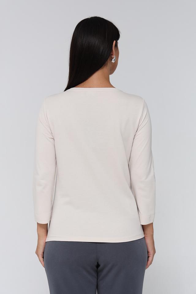 Модель имеет прямой крой, круглый вырез горловины и рукава длиной три четверти. Футболка выполнена из высококачественного материала – сочетания 50% хлопка и 50% модала, что обеспечивает комфорт при носке, мягкость и приятные тактильные ощущения.