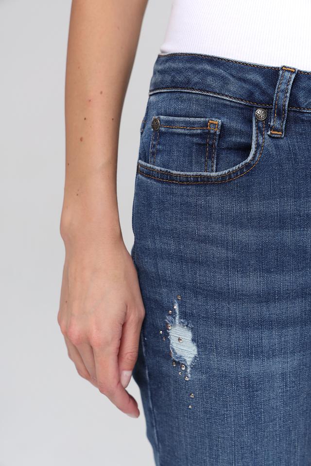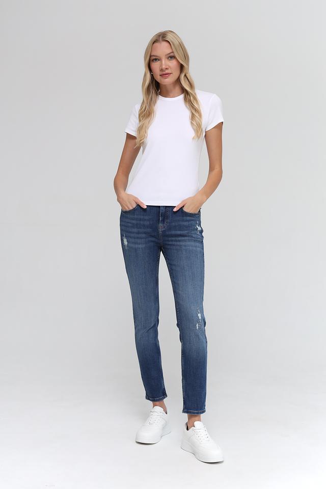 Джинсы украшены небольшими разрезами на передней части штанин, добавляющими им непринужденности и актуальности. Ткань состоит из хлопка (80%), полиэстера (17%) и эластана (3%), что обеспечивает удобство в носке, хорошую форму и небольшую эластичность.