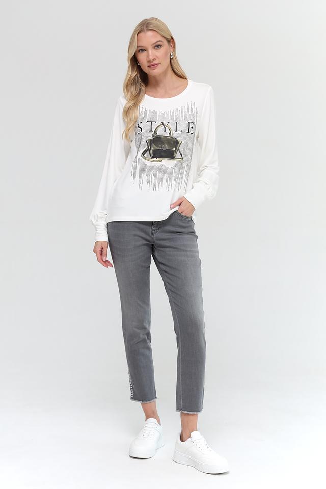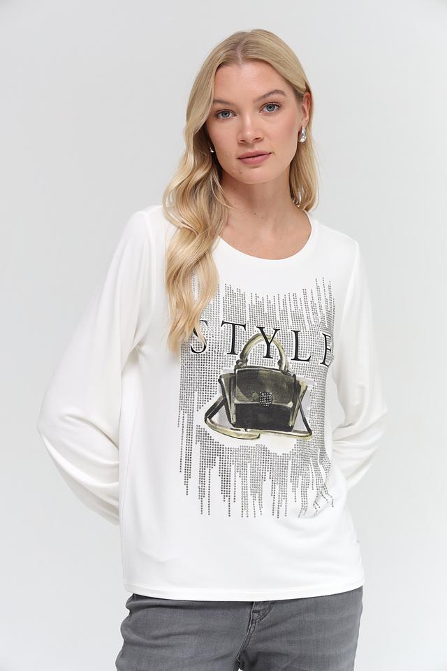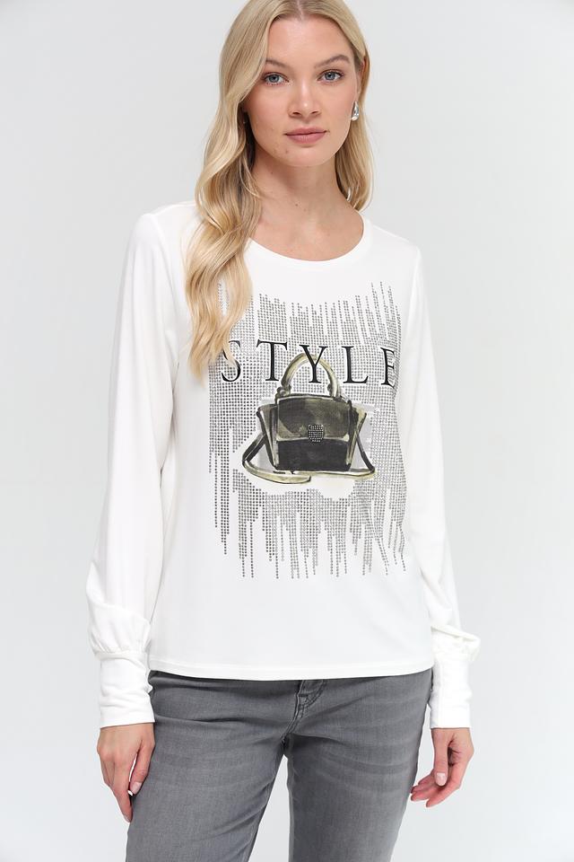 Эта блуза от Monari выполнена в белом цвете и украшена эффектным принтом с изображением сумки и надписью "STYLE". Принт выполнен в чёрно-серебристой гамме, что придает блузе изысканность.