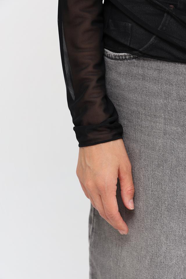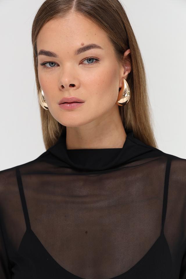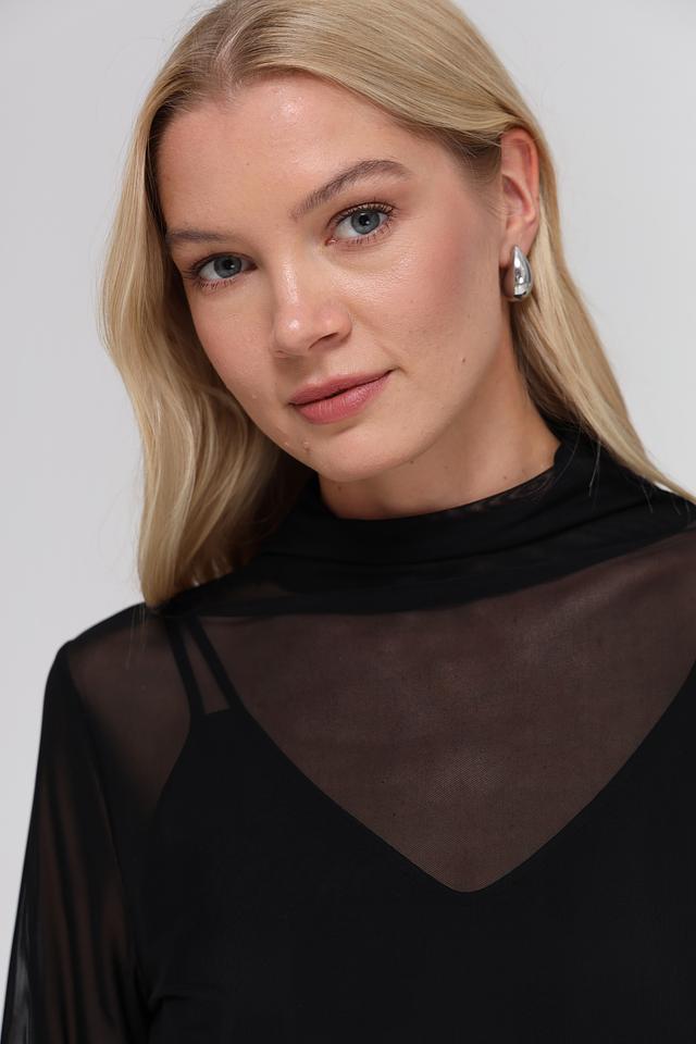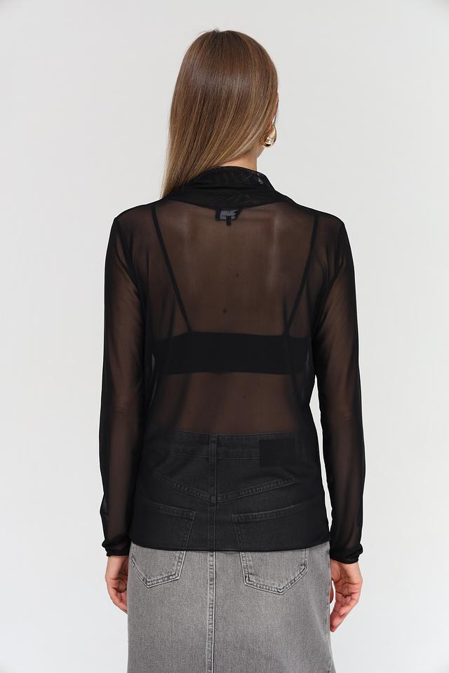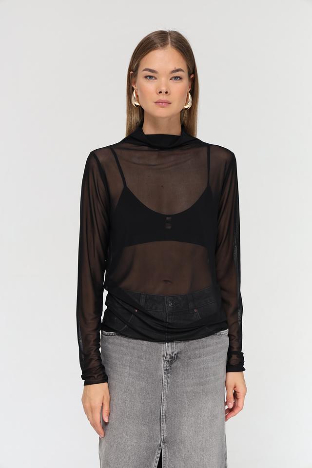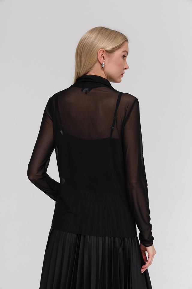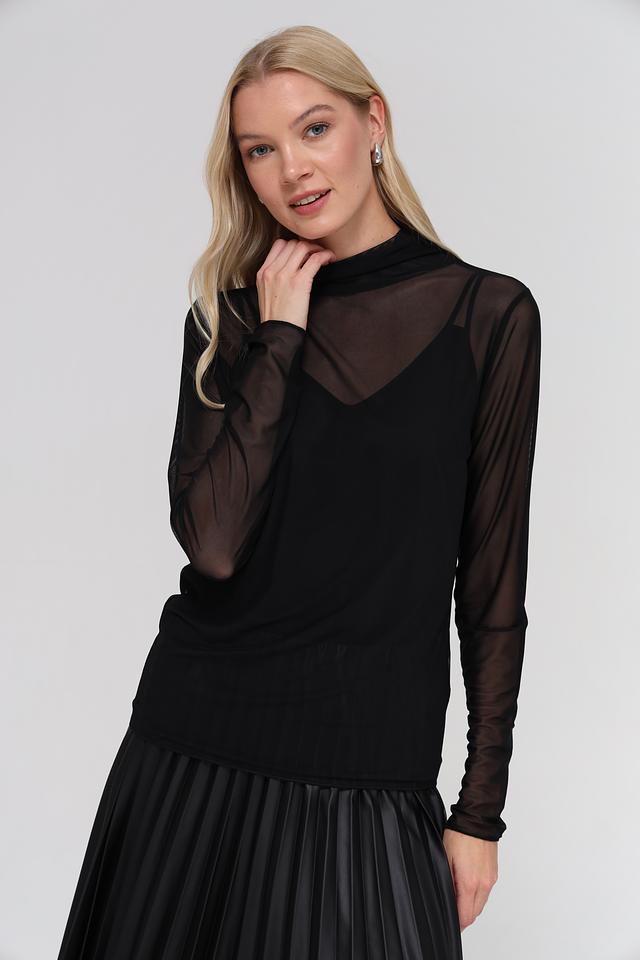 Чёрный пуловер от Monari из полупрозрачной ткани с длинным рукавом и высоким горлом. Элегантная модель, идеально подходящая для создания многослойных образов и добавления изысканности в ваш гардероб. Состав: полиэстер 92%, эластан 8%