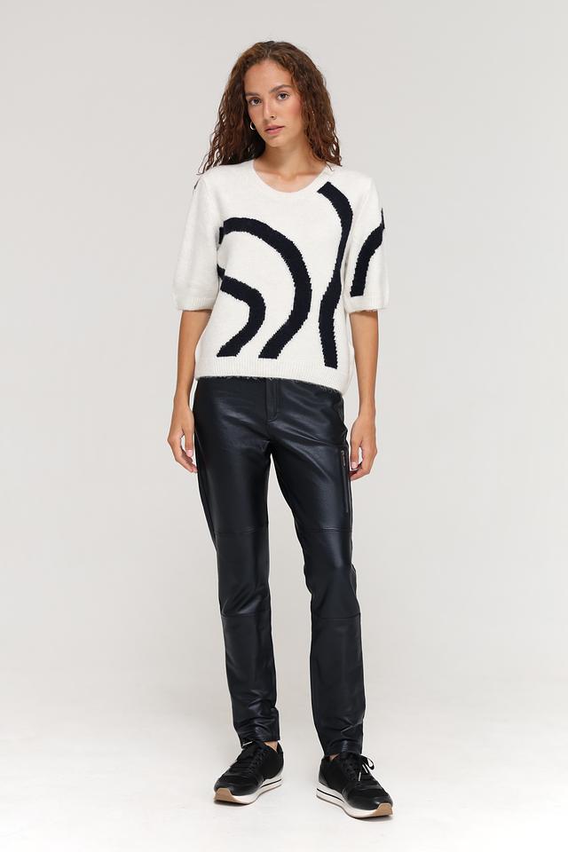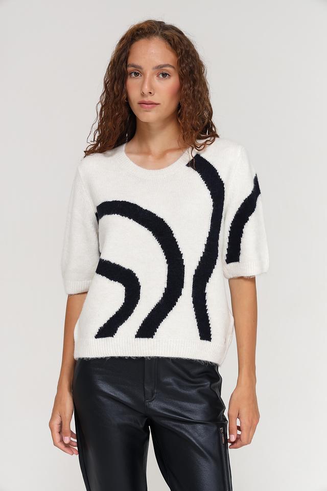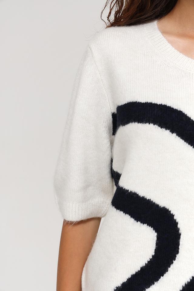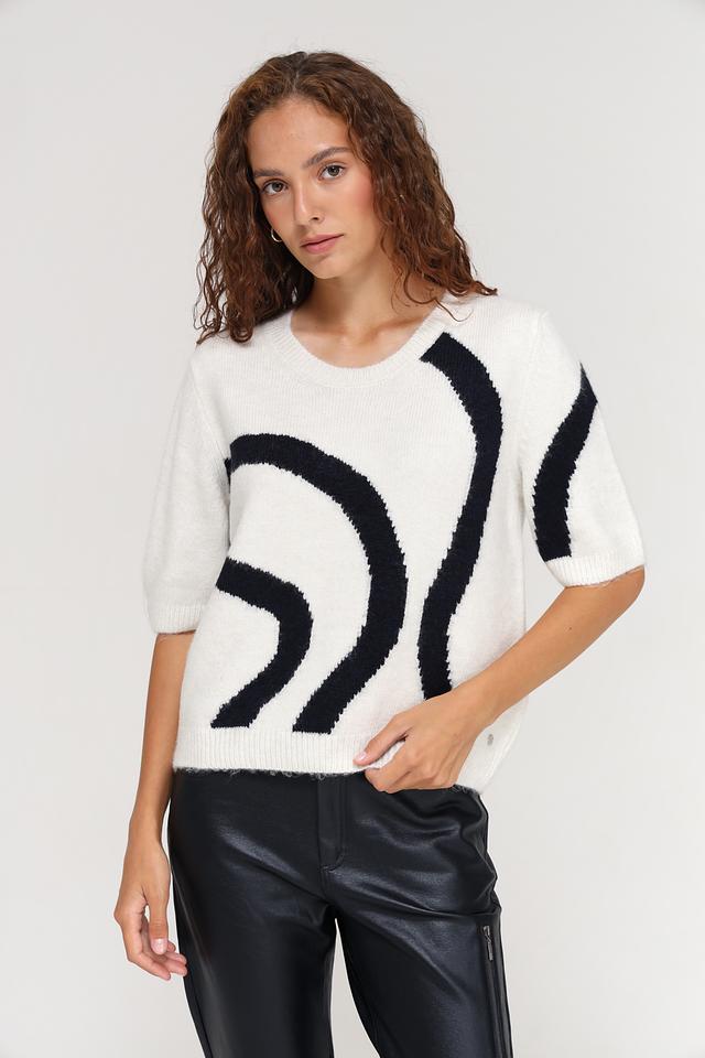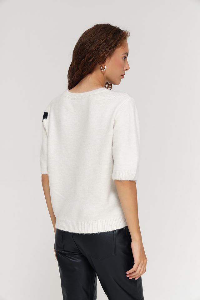 Пуловер имеет свободный крой и короткий рукав, что делает его идеальным для тёплой погоды или для создания многослойных образов. Белый цвет и оригинальный чёрный принт придают изделию современный и стильный вид.