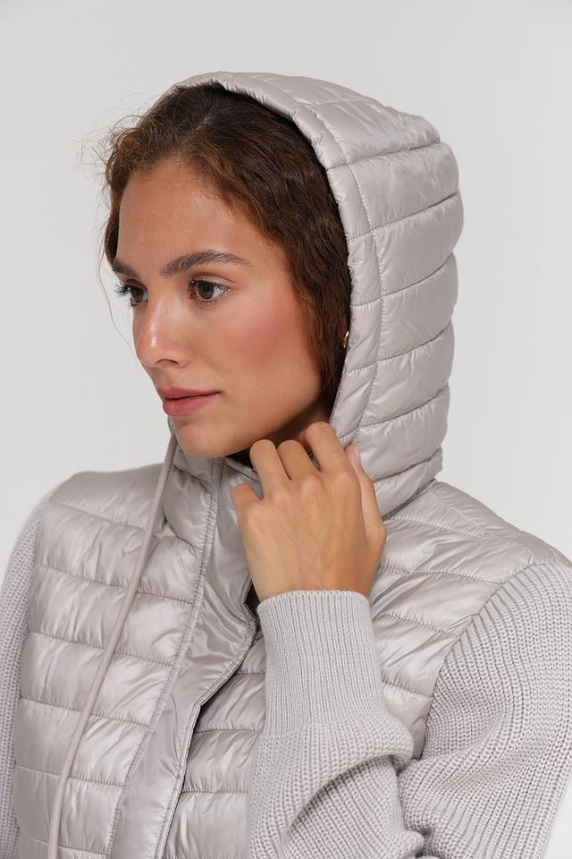 Рукава куртки выполнены из серого трикотажа, что добавляет комфорта и создает интересный контраст текстур. Куртка застегивается на молнию, имеет высокий воротник и капюшон с регулируемыми шнурками.