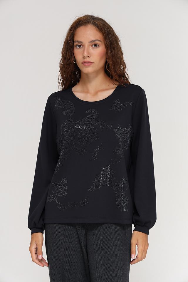 Этот стильный пуловер от Monari станет прекрасным дополнением к вашему гардеробу. Выполненный в классическом чёрном цвете, он украшен эффектным декором из страз, придающим образу изысканность и блеск.