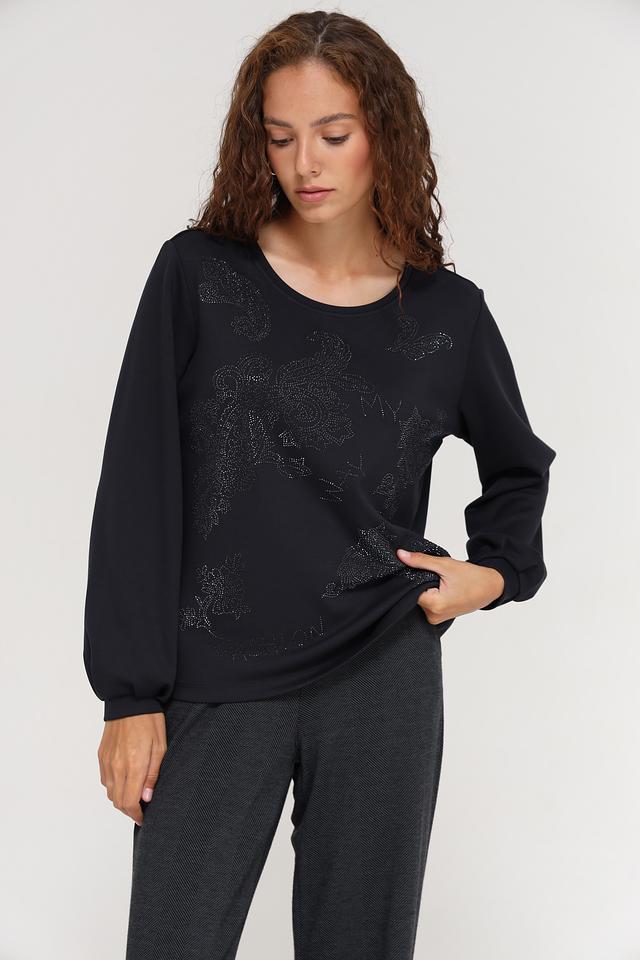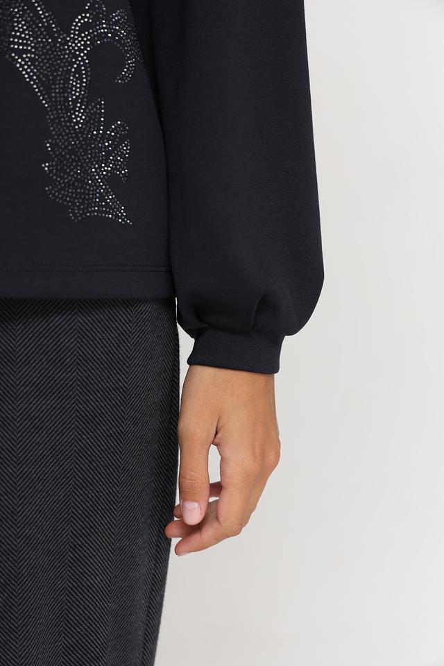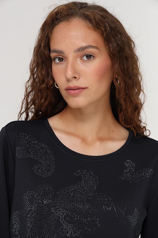 Чёрный пуловер Monari с оригинальным декором из страз. Изготовлен из мягкого сочетания полиэстера, вискозы и эластана, обеспечивающего комфорт и удобство в носке. Состав: полиэстер 55%, вискоза 38%, эластан 7%