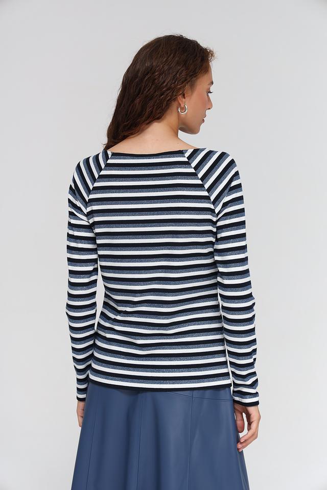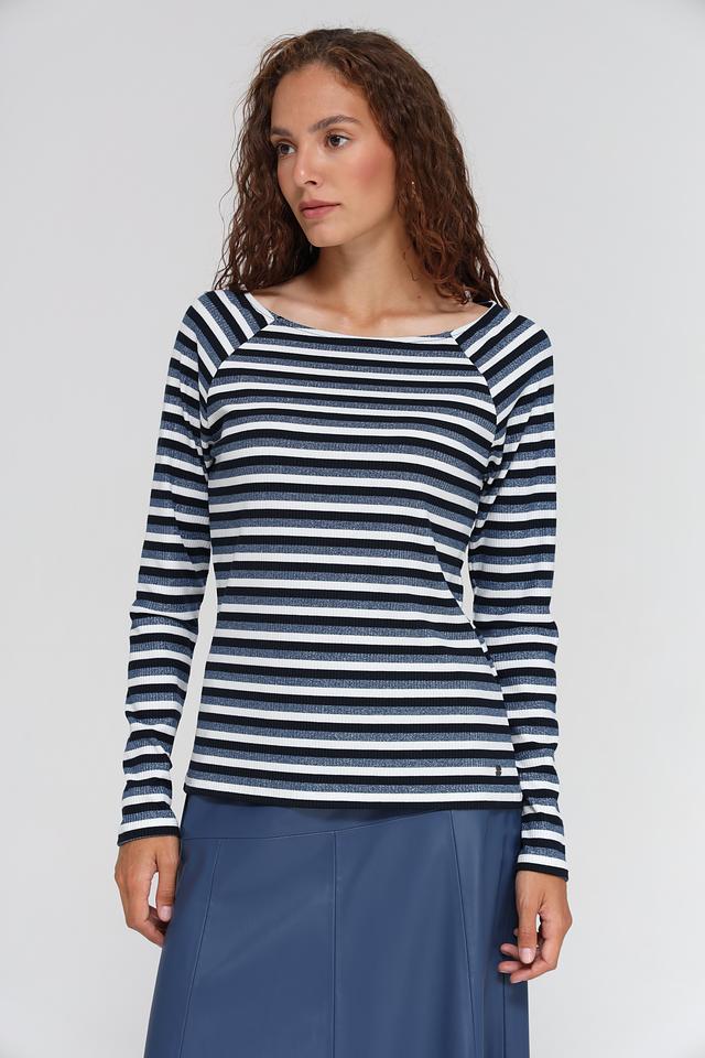 Лонгслив выполнен в классической полосатой расцветке, сочетающей в себе оттенки синего и белого. Круглый вырез горловины и длинные рукава делают его универсальным для различных образов. Приталенный силуэт подчеркивает фигуру, а эластан в составе обеспечивает отличную посадку и свободу движений.