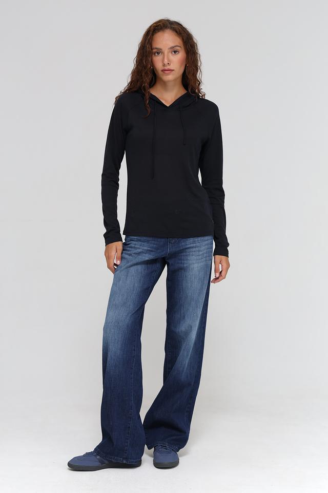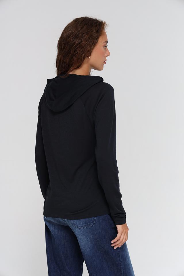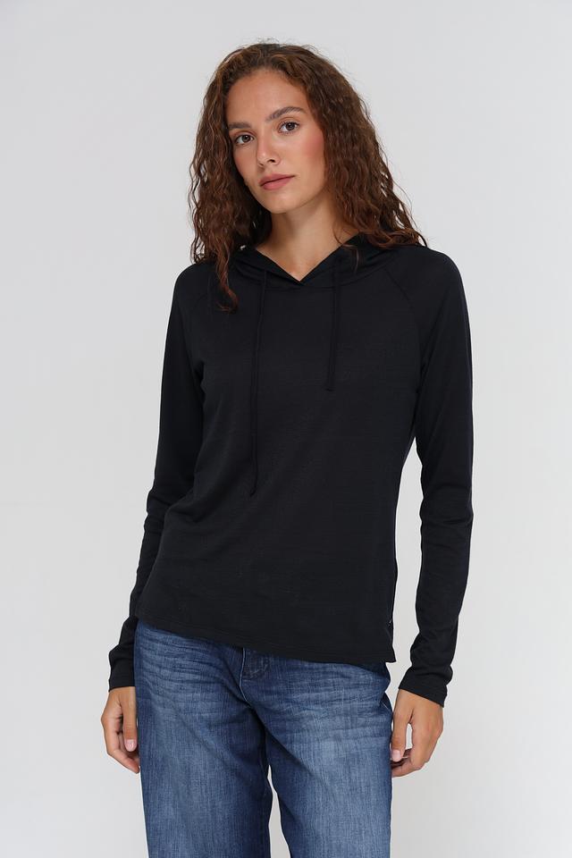 Чёрный пуловер Monari с капюшоном и длинными рукавами – это стильная и комфортная модель на каждый день. Изготовлен из мягкой вискозы с добавлением полиэстера и полиамида, обеспечивающих приятные тактильные ощущения и долговечность. Состав: вискоза 75%, метализ.полиэстер 15%, полиамид 10%