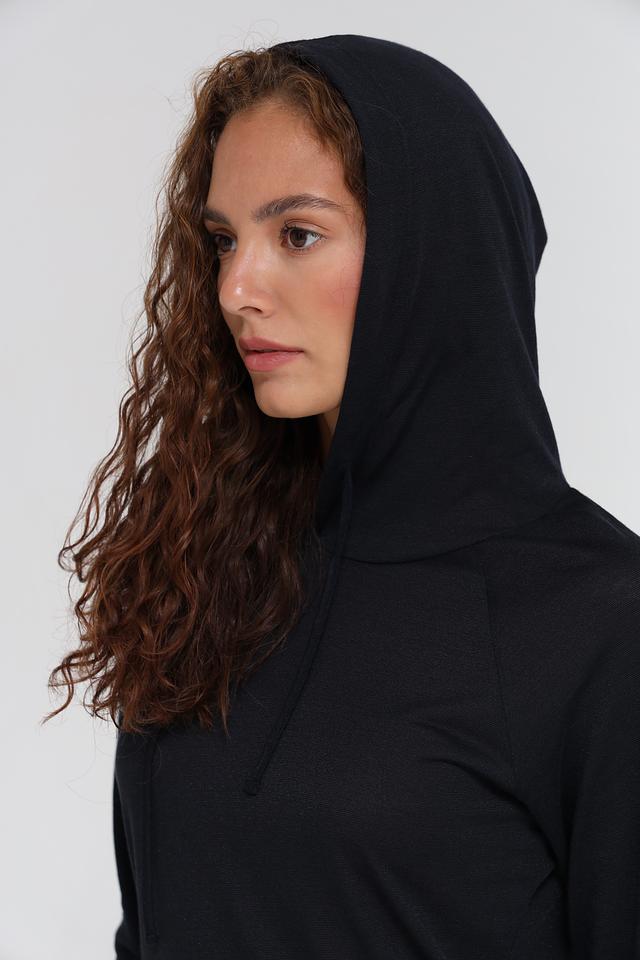 Пуловер имеет прямой крой, длинные рукава и капюшон с регулируемыми шнурками. Вырез горловины V-образный, что добавляет женственности силуэту. Ткань мягкая и приятная к телу, благодаря составу: 75% вискоза, 15% метализированный полиэстер и 10% полиамид.