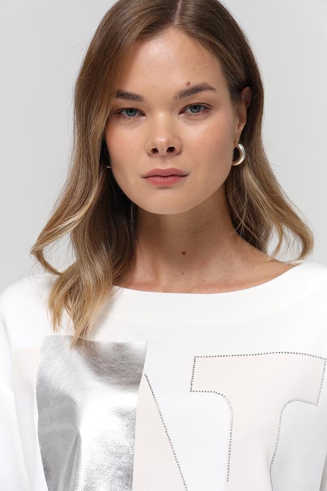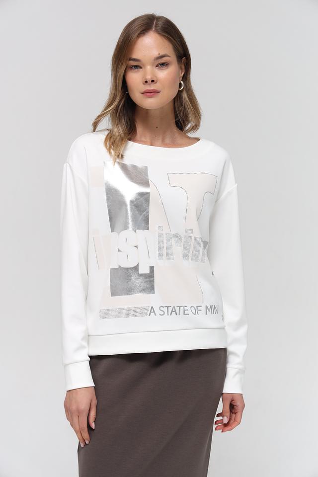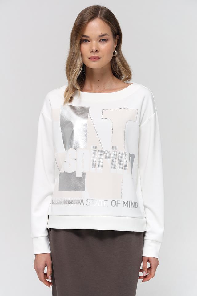 Этот стильный пуловер от Monari выполнен в белом цвете и украшен эффектным принтом с надписью "Inspiring A State of Mind". Модель имеет свободный крой, который обеспечивает комфорт и свободу движений.